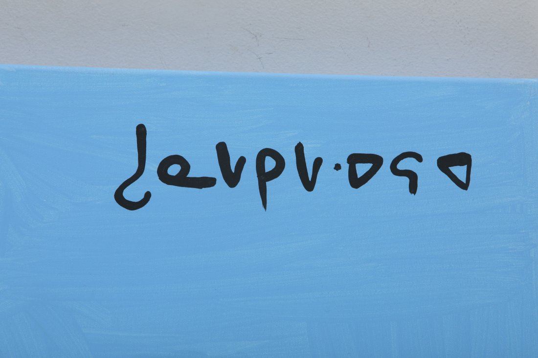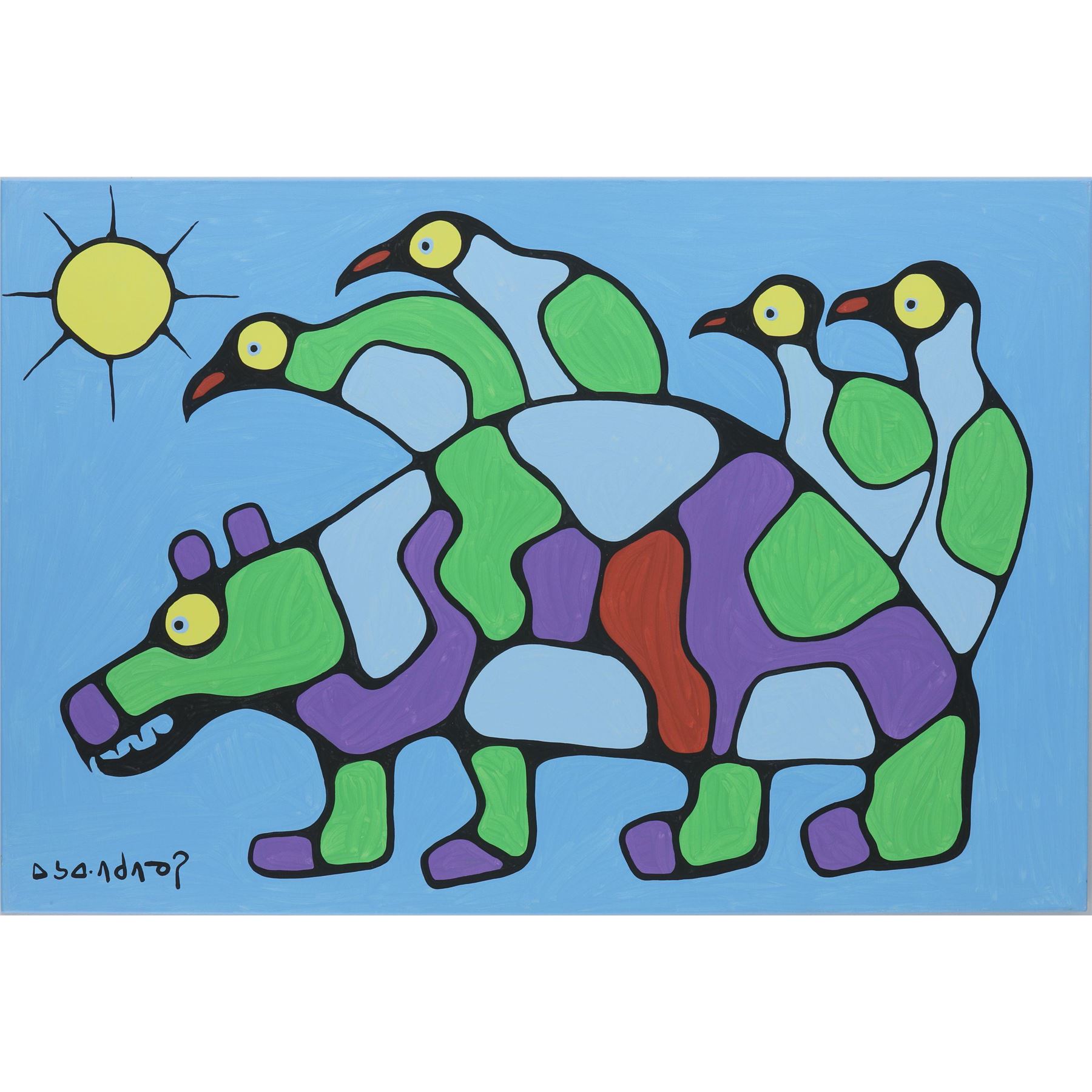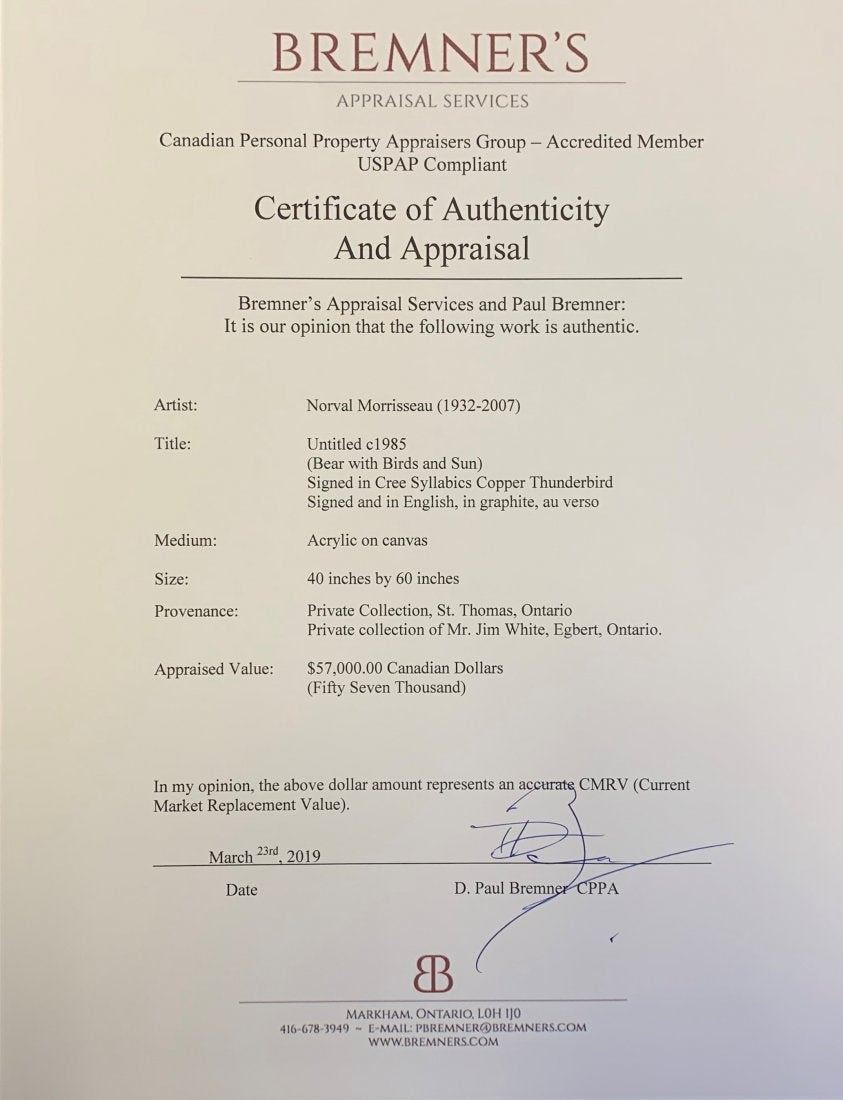 Norval Morrisseau's "Bear With Birds and Sun" original acrylic on canvas painting. Certified authentic and appraised at $57,000 CAN. 40" x 60".