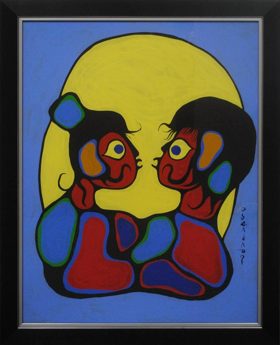 Norval Morrisseau's "Brother and Sister" original acrylic on canvas. Certified authentic and professionally appraised at $22,000 CAN. Inuit art, Native art. Image- 39 1/2" x 30". Frame- 45 1/2" x 36 1/4".