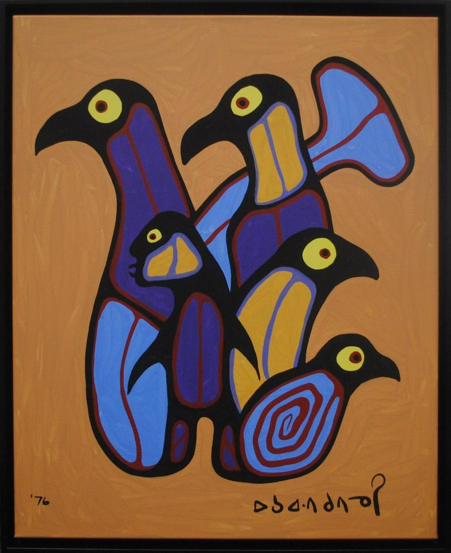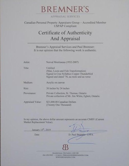 Norval Morrisseau's "Man, Loons and Fish Transformation" original acrylic on canvas. Signed in Cree syllabics Copper Thunderbird. Signed and dated '76, au recto and au verso. Certified authentic and appraised at $21,000 CAN. Inuit art, Native art. Image- 30" x 24". Frame- 32" x 25 1/2".