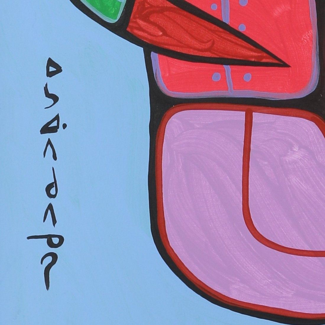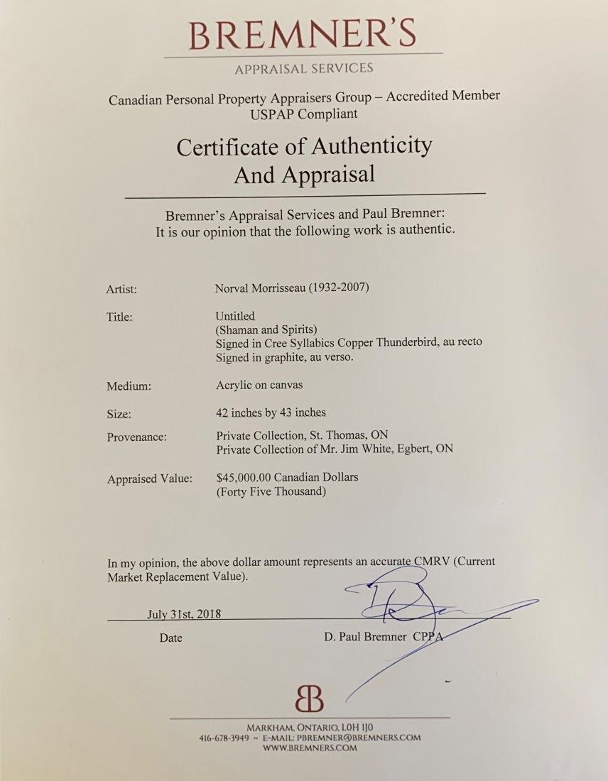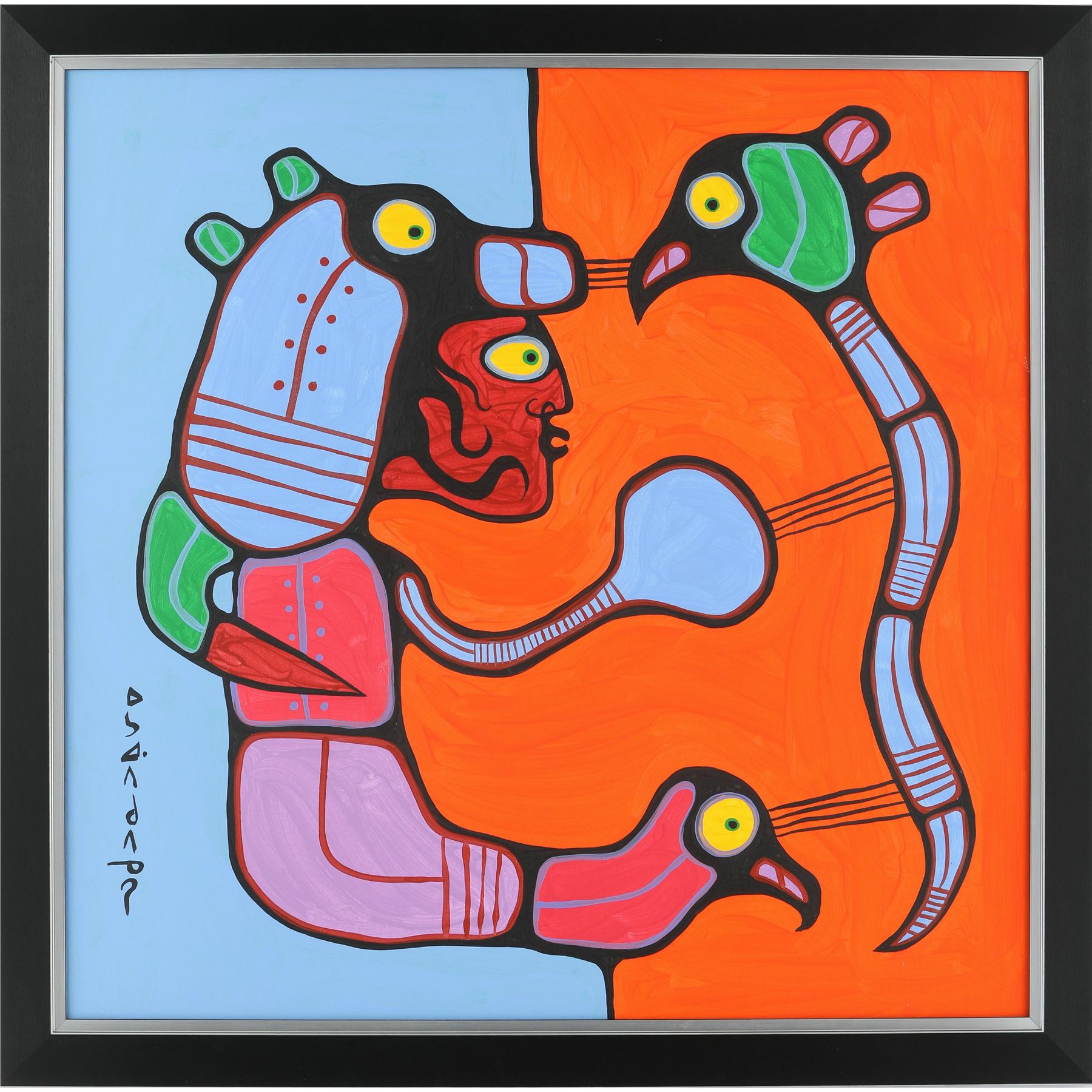 Norval Morrisseau's "Shaman and Spirits" original acrylic on canvas painting. This piece has been professionally custom framed with an inner frame liner. This piece has been certified authentic and genuine, and has been appraised at $45,000 CAN. Image- 41" x 42". Frame- 47" x 47".