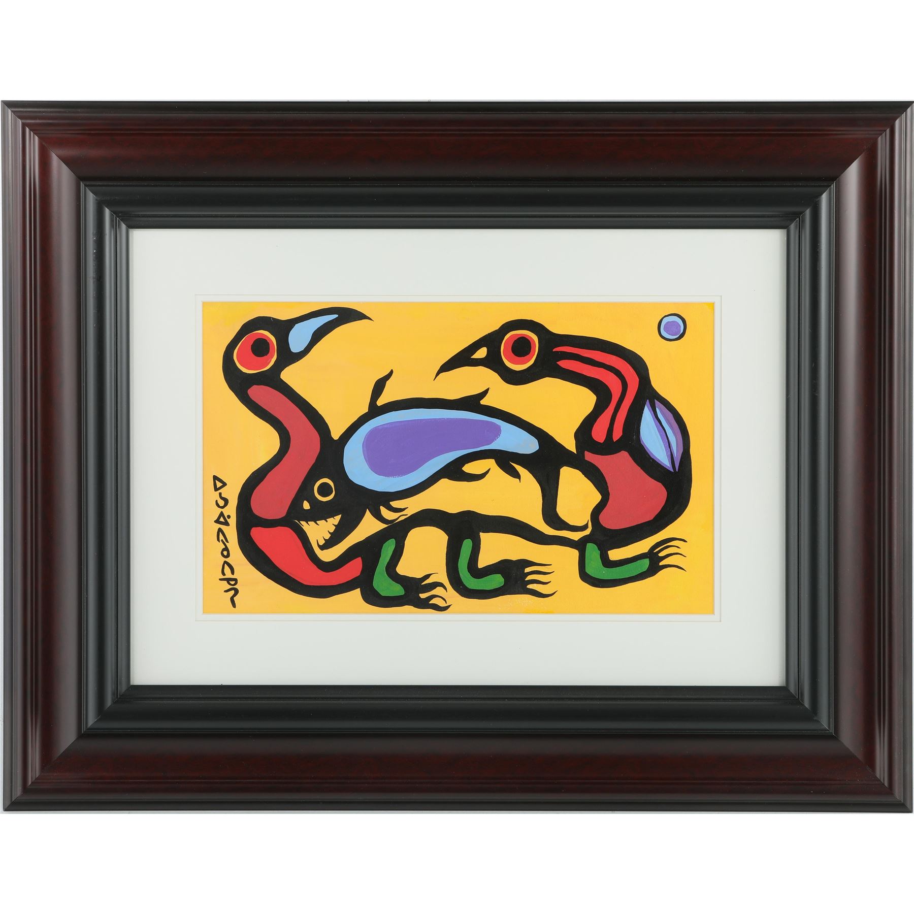 Norval Morrisseau's "Transforming" original acrylic on paper. Signed in Cree syllabics Copper Thunderbird, au recto. This piece has been certified genuine and authentic, and has been appraised at $4,700 CAN. Image- 12 1/4" x 20". Frame- 27 1/2" x 35 1/2".
