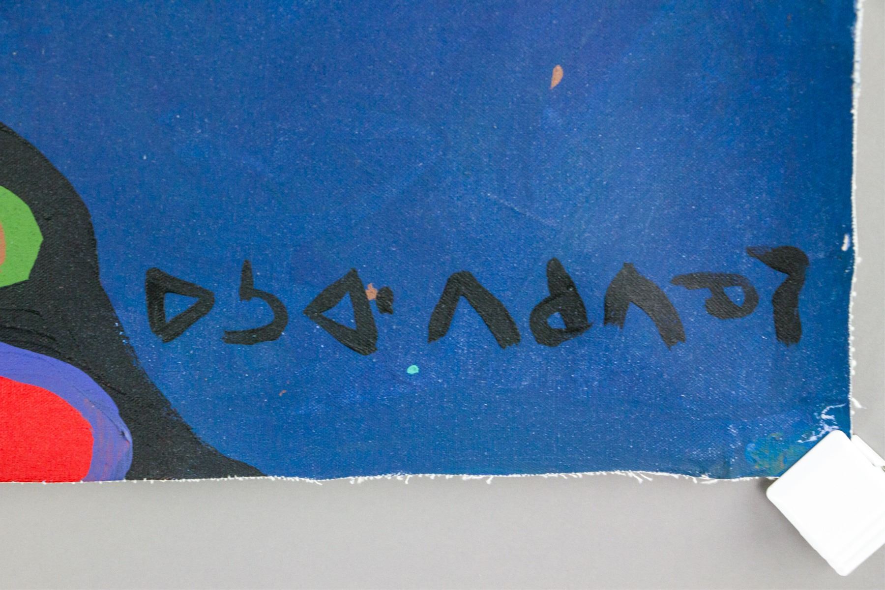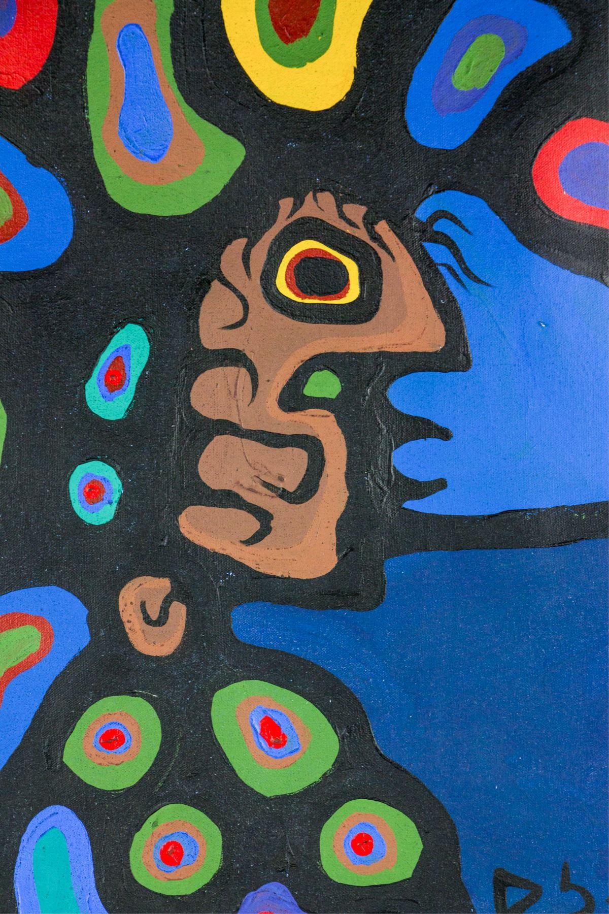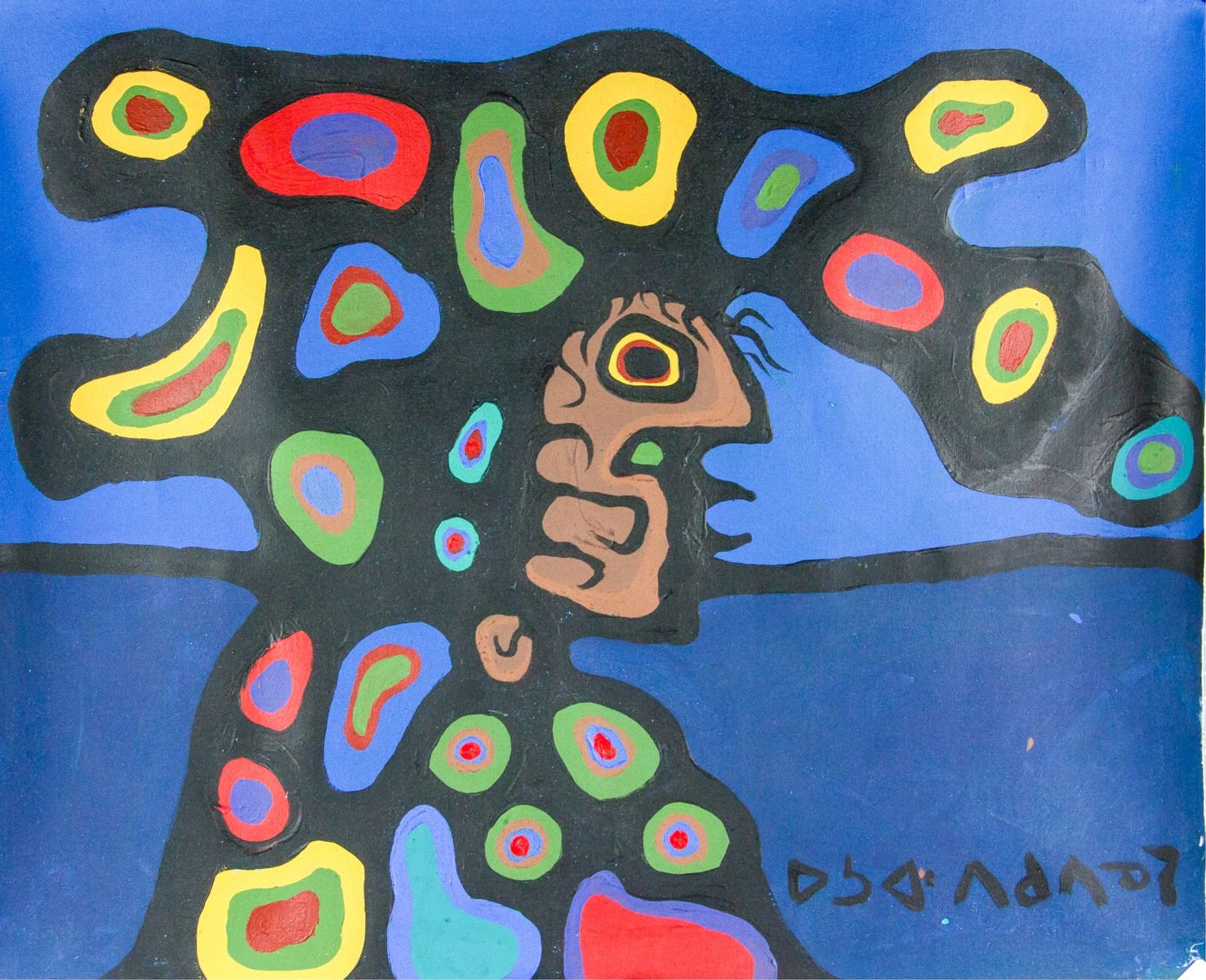 Acrylic on canvas, featuring Shaman, signed by Norval Morrisseau (1932-2007) Canadian on lower right corner. 72.5 x 57.5 cm. Circa 1975. Provenance: Acquired directly from the Collection of Christian Morrisseau. Norval Morrisseau (1932-2007) was an Anishinaabe Aboriginal Canadian artist. Best known for his paintings of mythical tableaux, his narrative works of figures and animals were painted in vibrant, fluorescent colors featuring thick black outlines akin to stained glass windows or woodcuts. “These paintings only remind you that you're an Indian. Inside somewhere, we're all Indians,” the self-taught artist once said. “So now when I befriend you, I'm trying to get the best Indian, bring out that Indianness in you to make you think that everything is sacred.” Born on March 14, 1932, in Beardmore, Ontario, he achieved widespread national success throughout his artistic career, garnering major commissions such as a large mural created for Expo 67 in 1967, which expressed the political dissatisfaction of the First Nations People of Canada. Morrisseau also regularly exhibited and sold his work in various Canadian galleries until his death in Toronto on December 4, 2007. Today, his work can be found in the collections of the Royal Ontario Museum, the National Gallery of Canada, the Dennos Museum Center, and the Art Gallery of Windsor, among many others. PROVENANCE: Private gallery collection