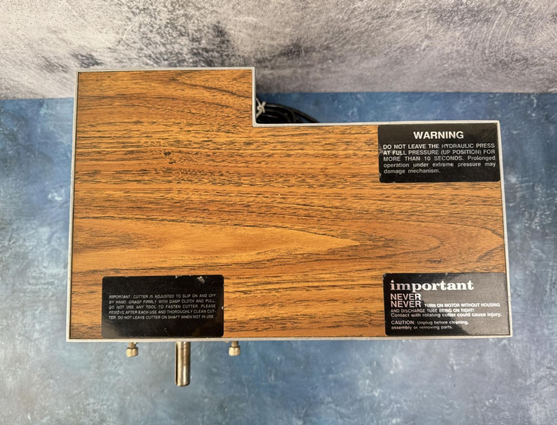 Missing cutting head assembly and drip tray for juicer press. There for cannot test fully because of safety mechanism. But the cutter motor turns for a second until the switch release.