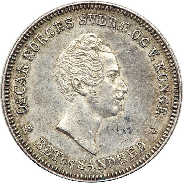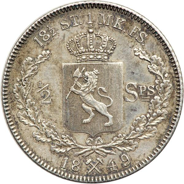 Norway. ½ Specie Daler, 1849. KM-316. Oscar I. Bust right. Reverse: Crowned arms. Sharply struck and scarce this nice. Choice Extremely Fine.