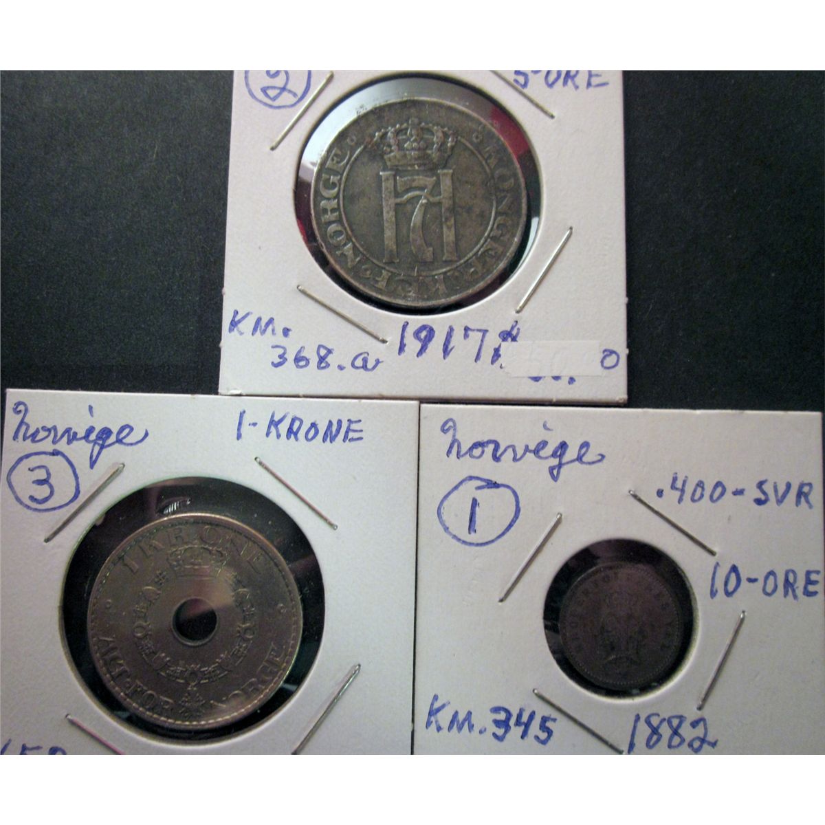 Norway; 1882 10 Ore, 1917 5 Ore & 1937 1 Krone. VF to EF.