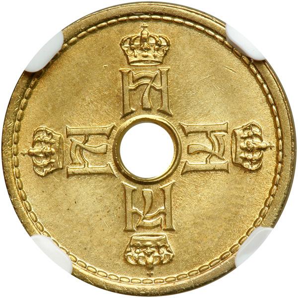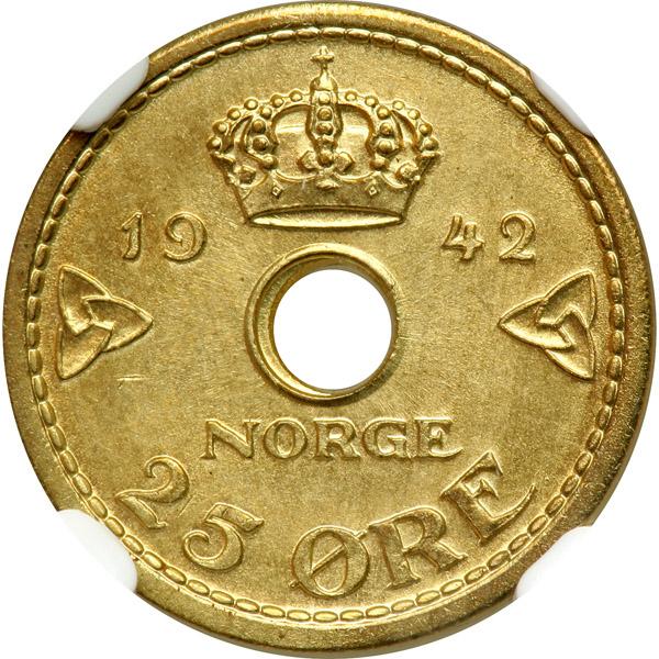 Norway. 25 Ore, 1942. SM-267; KM-392. Nickel-Brass. Haakon VII. All except 10,300 pieces were melted. World War II government in exile issue. Scarce. NGC graded MS-64.