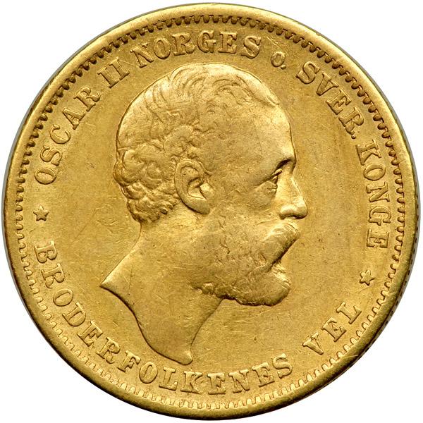 Norway. 5 Species - 20 Kroner, 1874. Fr-15; KM-348. Oscar II, 1872-1905. Head right. Reverse: Lion shield and two values. PCGS graded EF-40.