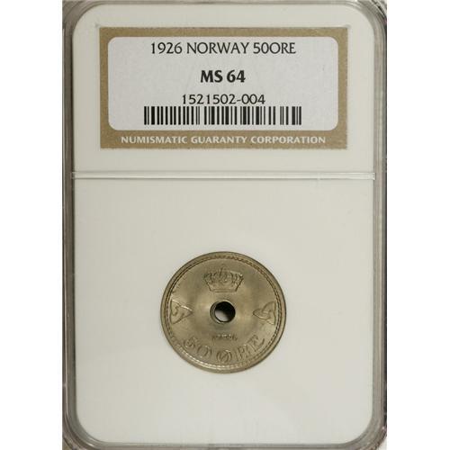 <B>Haakon VII 50 Ore 1926, </B></I>KM386, MS64 NGC, a choice original coin with no spots.<BR><BR><b>Shipping:</b> Coins & Currency (<a target="_blank" href="http://www.heritageauctions.com/common/shipping.php">view shipping information</a>)