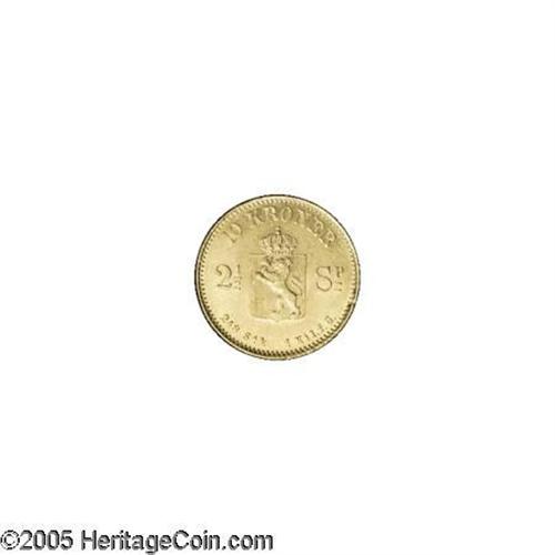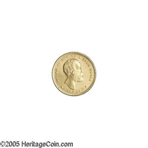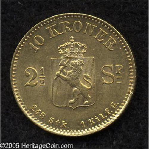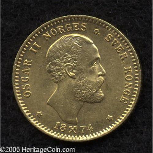 <B>Oscar II gold 10 Kroner/2 1/2 Speciedaler 1874, </B></I>KM347, choice AU-UNC, fully lustrous and very appealing. Rare type.