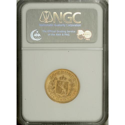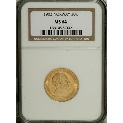 <B>Oscar II gold 20 Kroner 1902, </B></I>KM355, MS64 NGC, a nice fully brilliant example.<BR><BR><b>Shipping:</b> Coins & Currency (<a target="_blank" href="http://www.heritageauctions.com/common/shipping.php">view shipping information</a>)