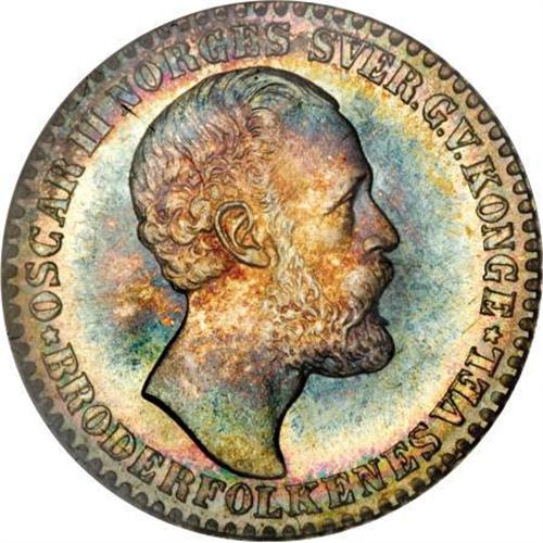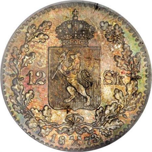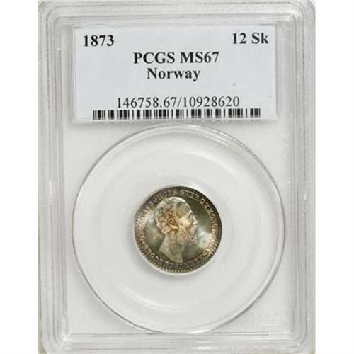 <B>Oscar II of Sweden 12 Skilling,</B></I> KM339, MS67 PCGS, a second example with equally stunning multicolored patina and virtually perfect surfaces. Very rare and appealing quality.<BR><BR><b>Shipping:</b> Coins & Currency (<a target="_blank" href="http://www.heritageauctions.com/common/shipping.php">view shipping information</a>)