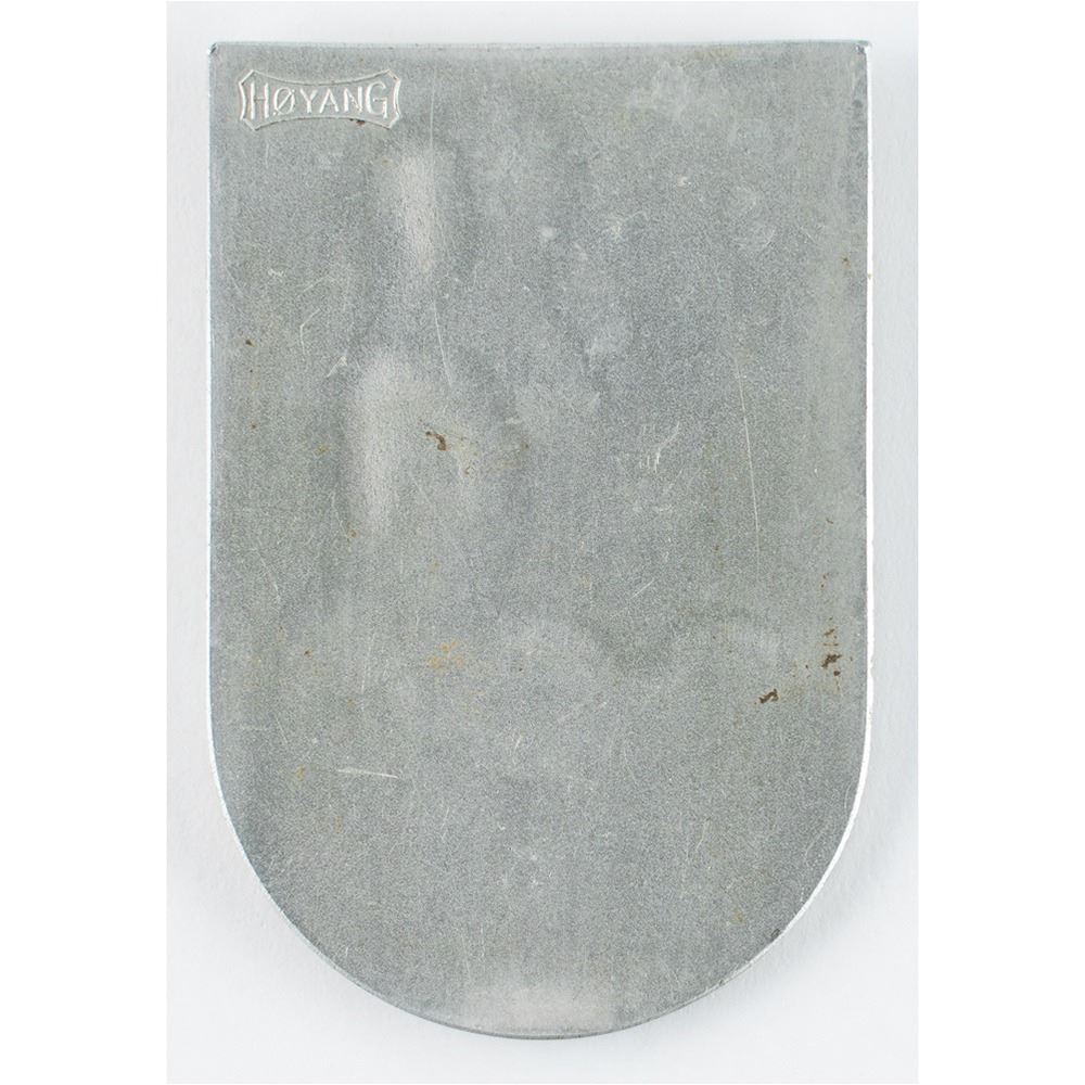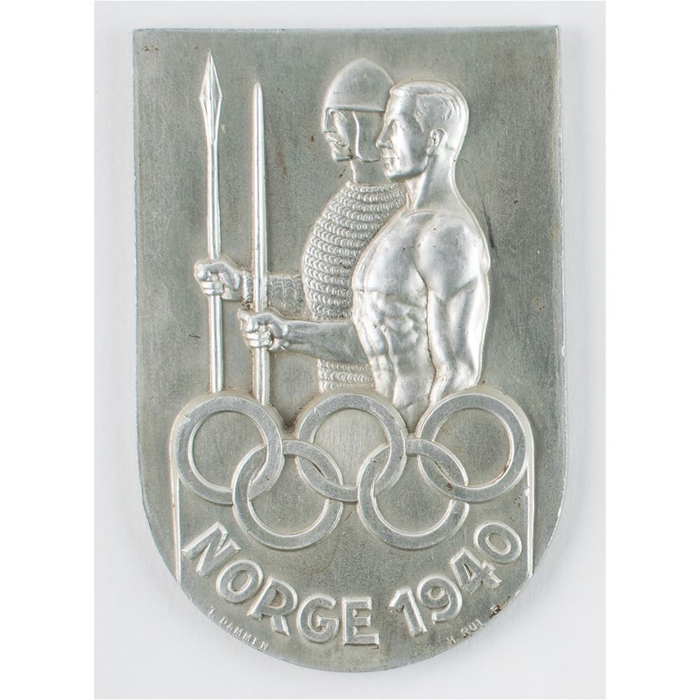 Aluminum presentation plaque of the Norwegian Olympic Committee for the 1940 Olympic Games, 22 gm, 44 mm x 70 mm, which depicts a medieval soldier and a modern athlete holding a spear and javelin over Olympic rings and raised text: “Norge 1940.†Lower border is marked “T. Dammen†and “H. Rui,†and the reverse bears a Hoyang maker mark. In fine condition.