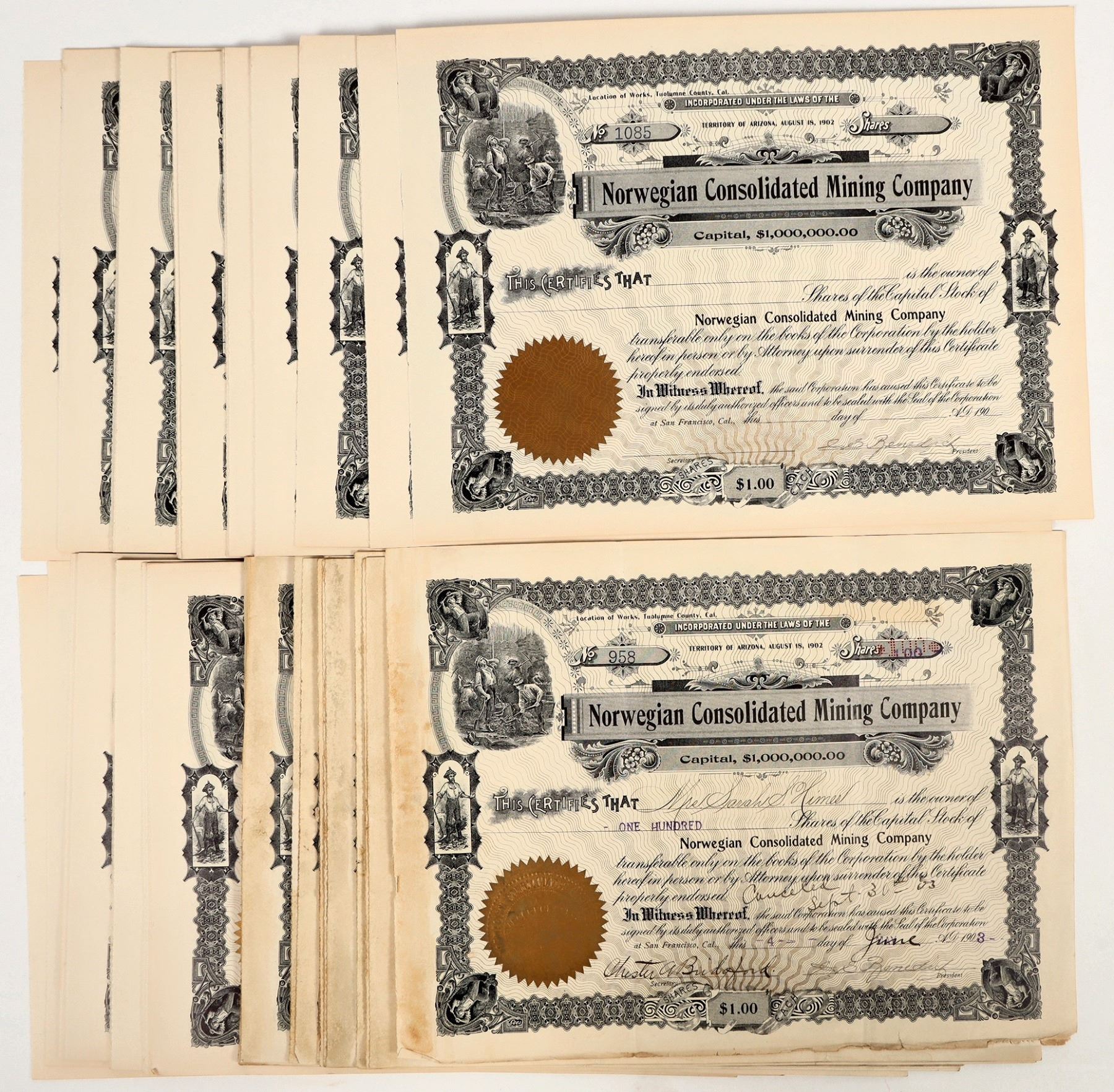 Approx. 50. I/C, U/U. VG or Better cond. Sixteen are issued/cancelled. The rest are signed but not issued. Issued 1902--03 Norwegian Consolidated Mining Co, Cancel is handwritten.