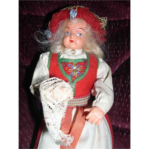 This doll was made in Norway to represent a Hardanger Bride. She is dressed in the typical Norwegian dress. I see no holes in the felt . The white is a little aged and I see one tiny brownish stain on the apron. I have not tried to clean her in any way. She has a celluloid head with celluloid hands. Her mohair wig is thin and could use a replacement but is hidden under an elaborate headpiece of yarn, gold trim and ribbons. She has her orignal hat and carries her hankie. There is a paper attached to the skirt that says...The Hardangerbrides wears a similiar costume th that ordinarly worn in Hardanger, but it is much more elaboraely decorated, and a silver crown is traditional headgear. The wedding costume is often inherited or borrowed from good neighbours. However, the bride must make her own hand-piece- a stitche dor embroidered piece of cloth under which she hides her hands during the procession to the church. This is a sign of virginity. Wedding parties in Hardanger are known to last for three days and nights.