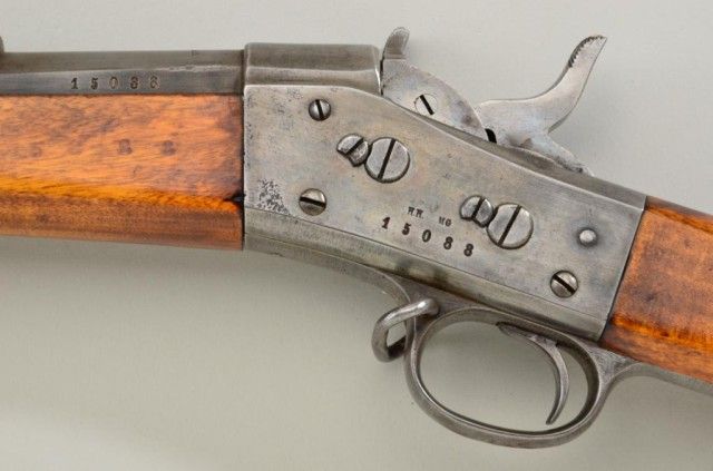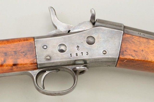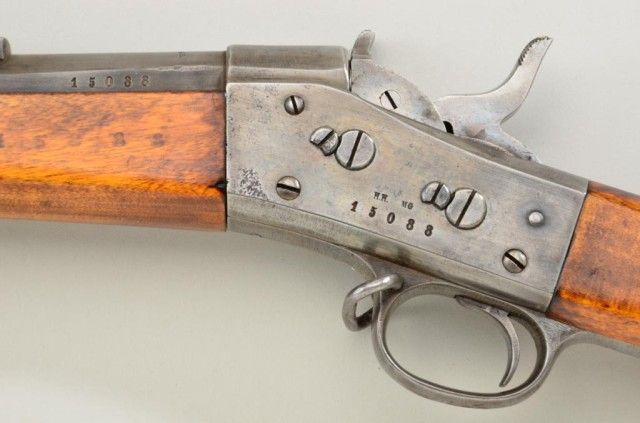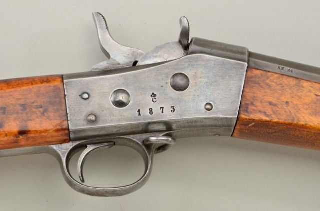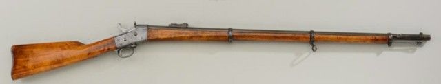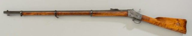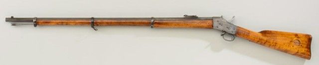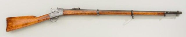 Norwegian Rolling Block rifle, 12.7mm cal., 37-1/2” barrel with integral bayonet lug on right side at muzzle; wood stocks, sling swivels, cleaning rod, #15088. This gun is in overall good condition showing a grey patina on metal surfaces, right side of receiver dated 1873 with crown over C proof, good bore, action and markings; wood is overall good showing an old re-finish and brass disc on left side of butt stock is absent; allmatching visible numbers. Est.: $400-$800.