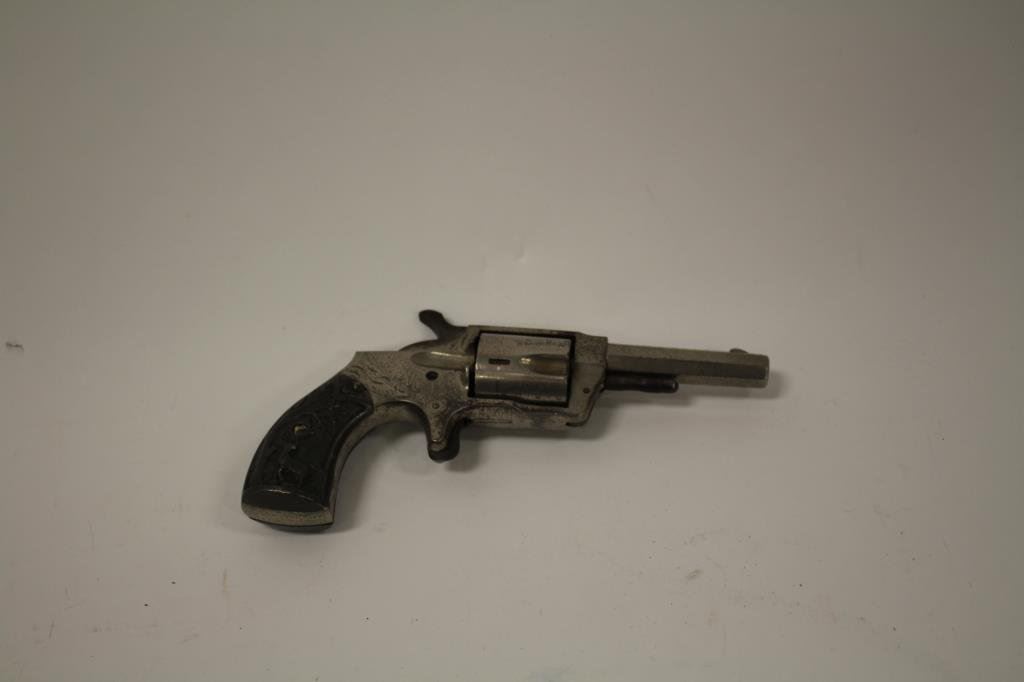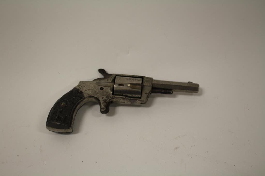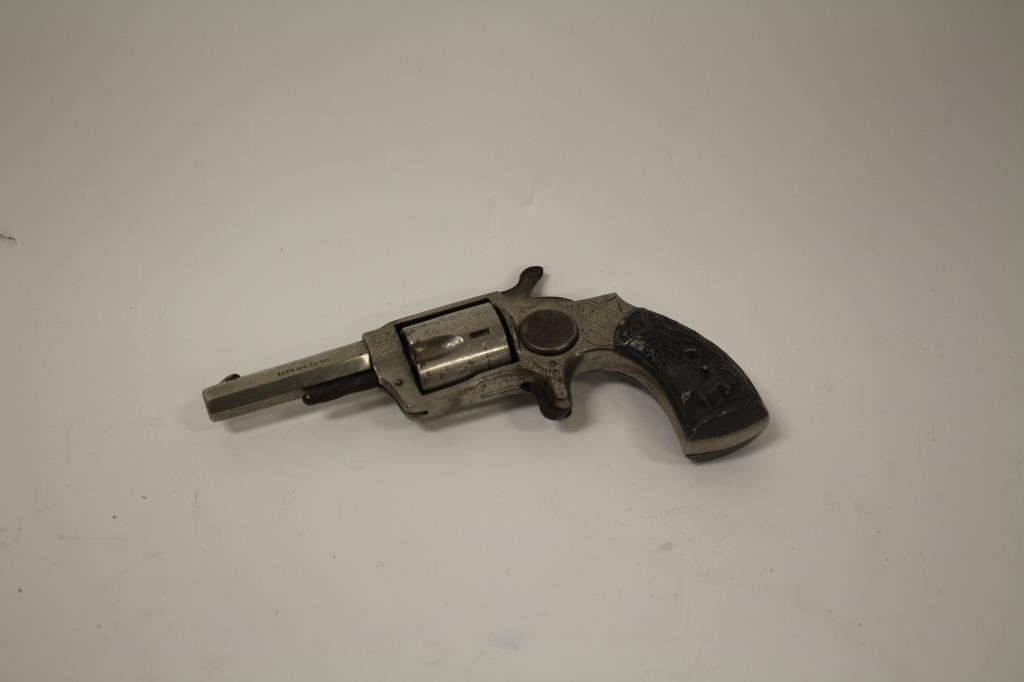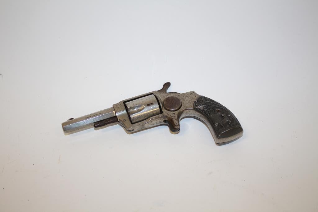engraved, nickel finish, cast pewter grips, no visible S/N, in overall good condition showing considerable original nickel finish, good bore, good action and good markings; grips are also good to very good overall. (Antique). Est.: $100-$200.