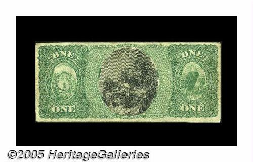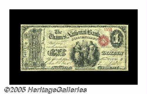 <B>Norwich, CT</B></I> - $1 Original Fr. 380 <B>The Thames NB</B></I> Ch. # 657<BR>This Original Series Ace has the Treasury serial number in blue. This signifies that this is one of the earliest First Charter notes, as the blue Treasury serial numbers were abandoned for red Treasury serial numbers after a couple of years into the National Bank Note era. This note is not included in the census that counts 12 Original Series notes. Also, this $1 may have been mounted with a stamp hinge at one time. <B>Very Fine.</B></I>