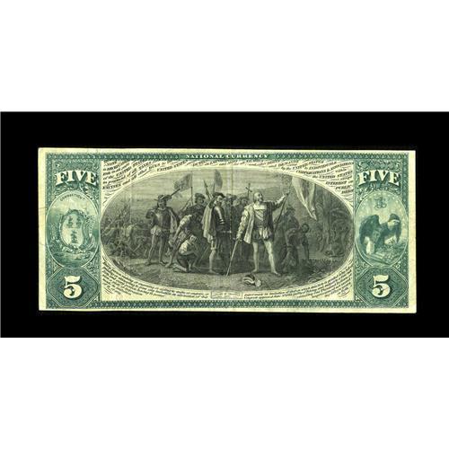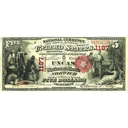 <B>Norwich, CT</B></I> - $5 1875 Fr. 401 <B>The Uncas NB</B></I> Ch. # 1187<BR>Although operating continuously through the note issuing period, this bank elected to issue large examples only. This attractive note is new to the census, and is the only 1875 $5 reported from here to date. Bright <B>Very Fine.</B></I>