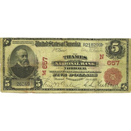 <B>Norwich, CT</B></I> - $5 1902 Red Seal Fr. 587 <B>The Thames NB</B></I> Ch. # (N)657<BR>This note was one of the last few hundred Red Seals printed for this institution. The other known survivors are 20,000 serial numbers away. Just days after the official changeover day to small size currency occurred this bank was liquidated, thus no small size notes were printed. At the end of the National Banking System, less than one half of one percent of the original $2.2 Million worth of issued notes was still outstanding. <B>Very Good, </B></I> with full remaining signatures and a couple unexplained paper pulls.