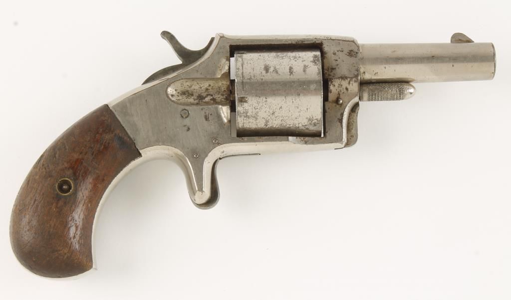 Large frame single action spur trigger 5 shot revolver circa 1880's to early 1890's with 2-1/2" round barrel. Nickel finish, walnut birdshead grips, non fluted cylinder and fixed sights. Good markings and very good working action. Condition: Good showing hazing in the nickel and light pitting. Grips are fair and show wear. *Antique Firearm*
