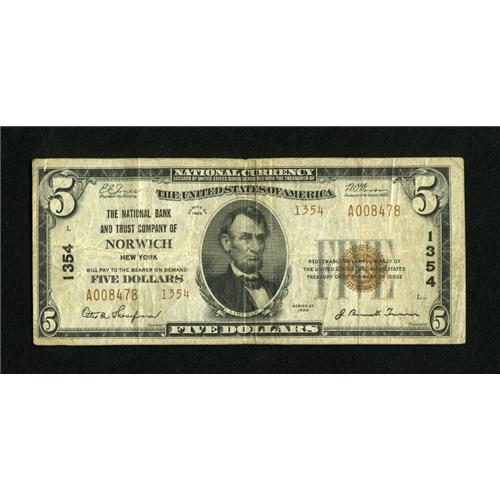<B>Norwich, NY</B></I> - $5 1929 Ty. 2 <B>The NB & TC</B></I> Ch. # 1354<BR>This may well be the only Type 2 note that is documented in the Kelly census. A margin tear is noticed at left. <B>Very Good-Fine.</B></I><BR><BR><b>Shipping:</b> Coins & Currency (<a target="_blank" href="http://www.heritageauctions.com/common/shipping.php">view shipping information</a>)