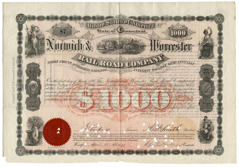 1877, Connecticut. Bond for $1000. Black/Pink/White. Very graphic multi-vignetted bond. Raised red seal at bottom left. Punch cancelled and fine.