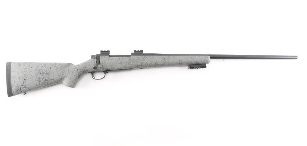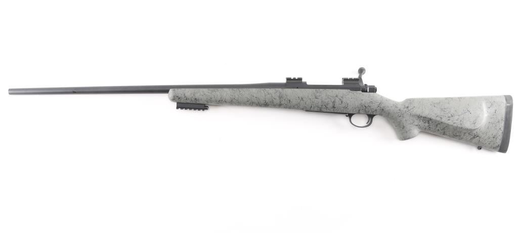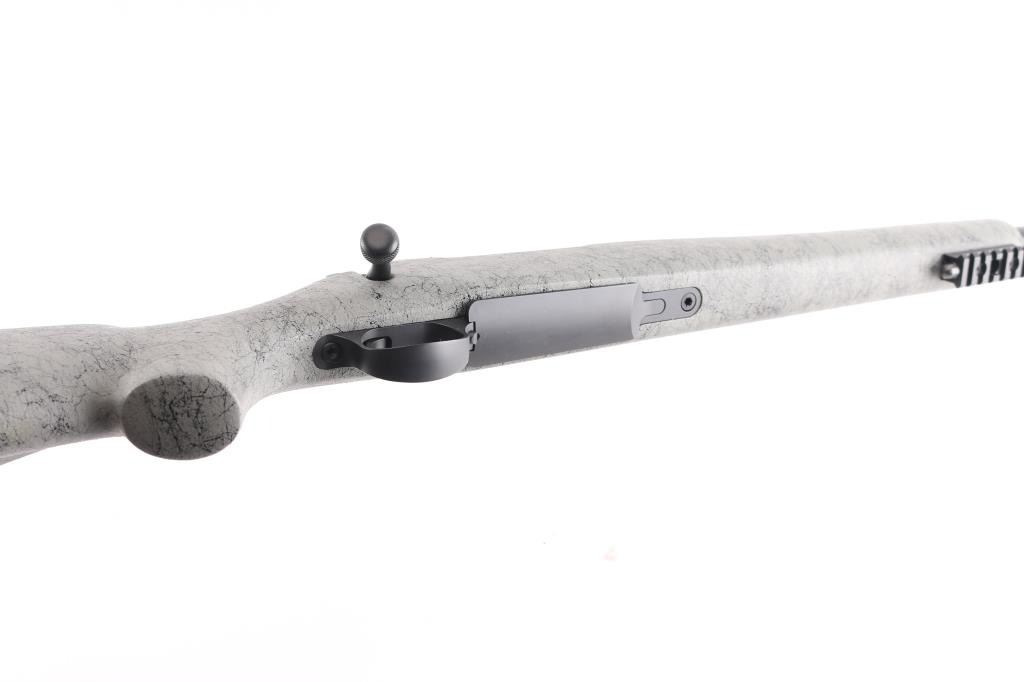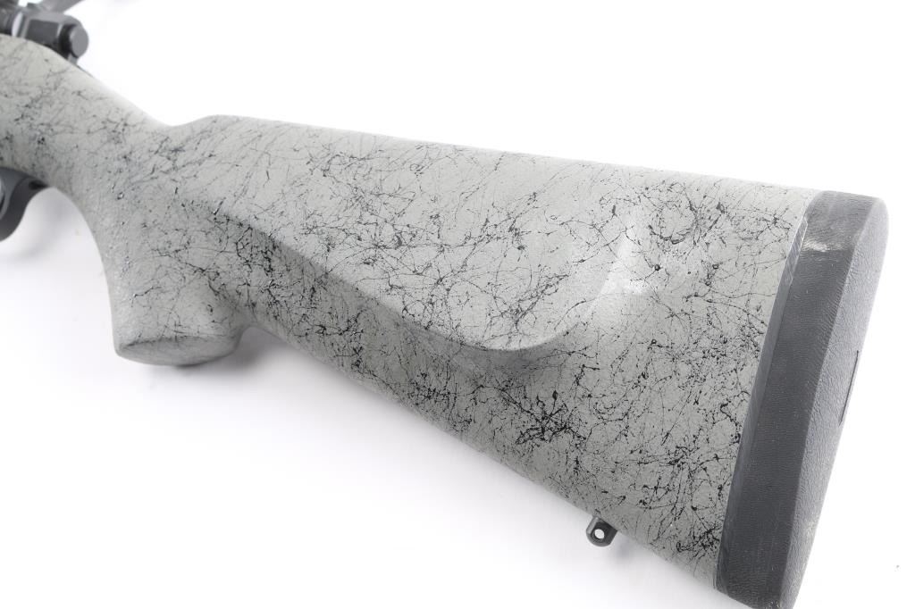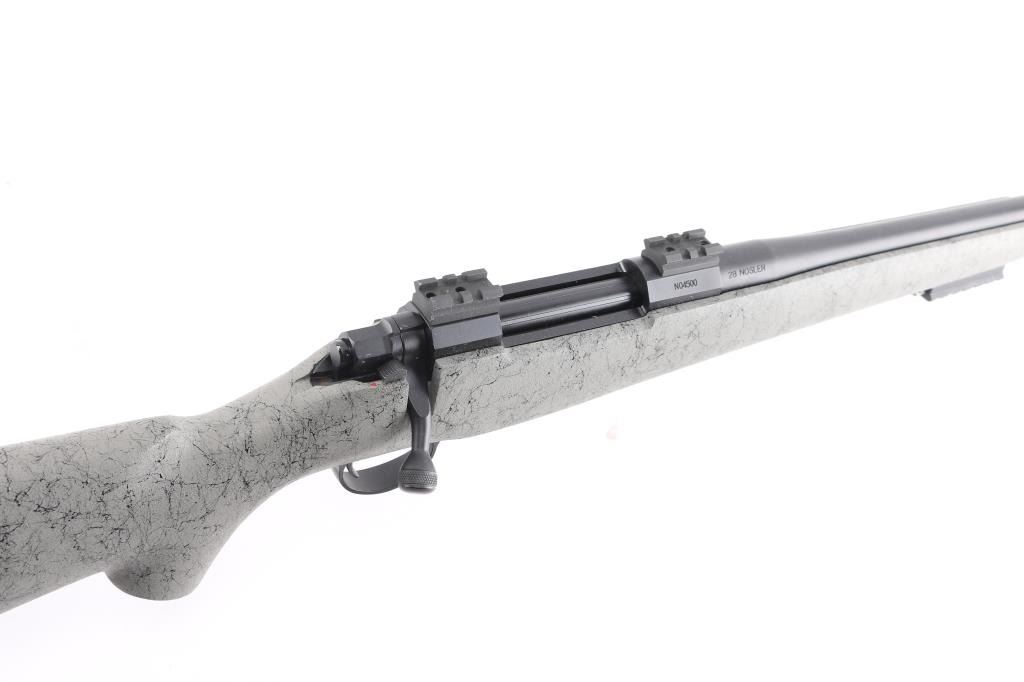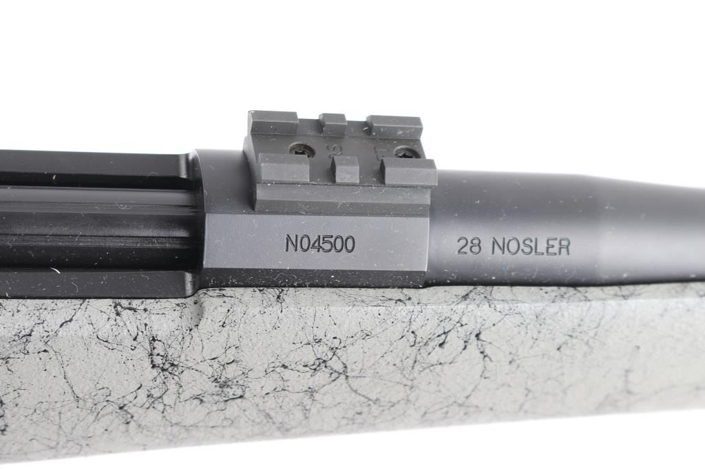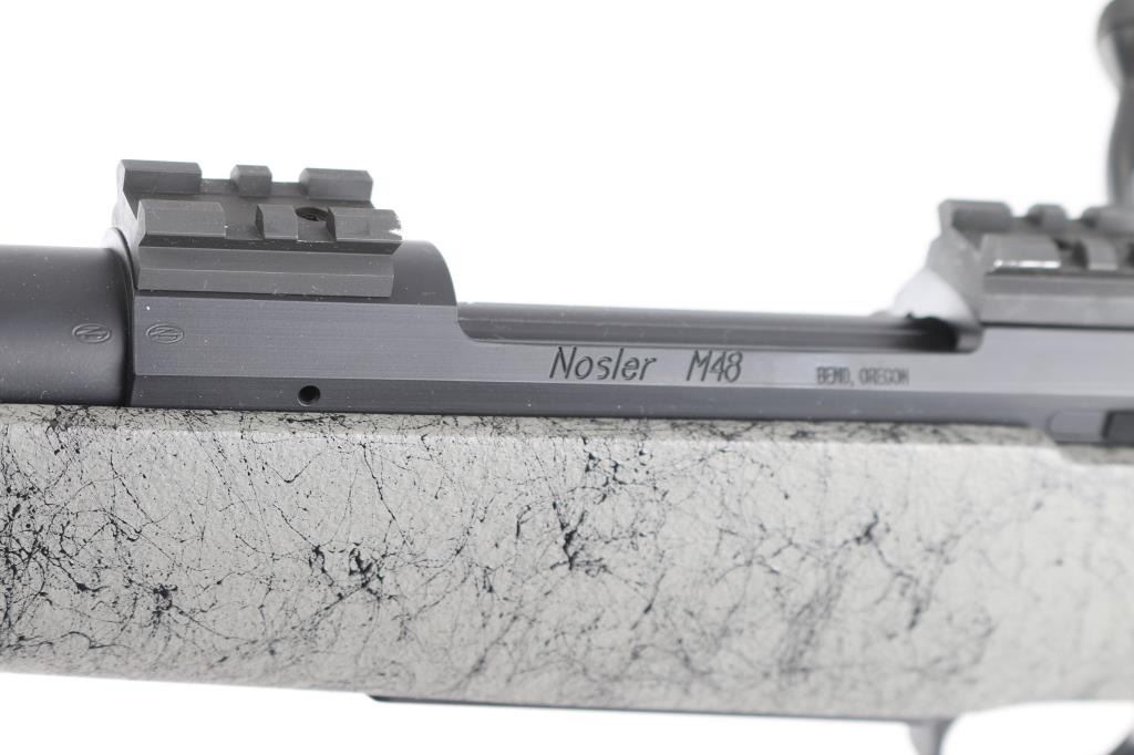 Aramid Fiber-Reinforced Composite stock with right-handed cheek piece, black rubber recoil pad, sling swivel studs, accessory rail on underside of forearm. 26" Cerakote Graphite finished stainless steel Match-Grade barrel, no provisions for sights. Nosler Model 48 Custom Action. Glass & Aluminum Pillar Bedding, hinged Floorplate, 2-Position Rocker Safety, scope bases installed on receiver. M.O.A. Accuracy with prescribed Nosler Ammunition. Bore is excellent/bright, rifle is in like new condition, except one minor rub on the barrel.