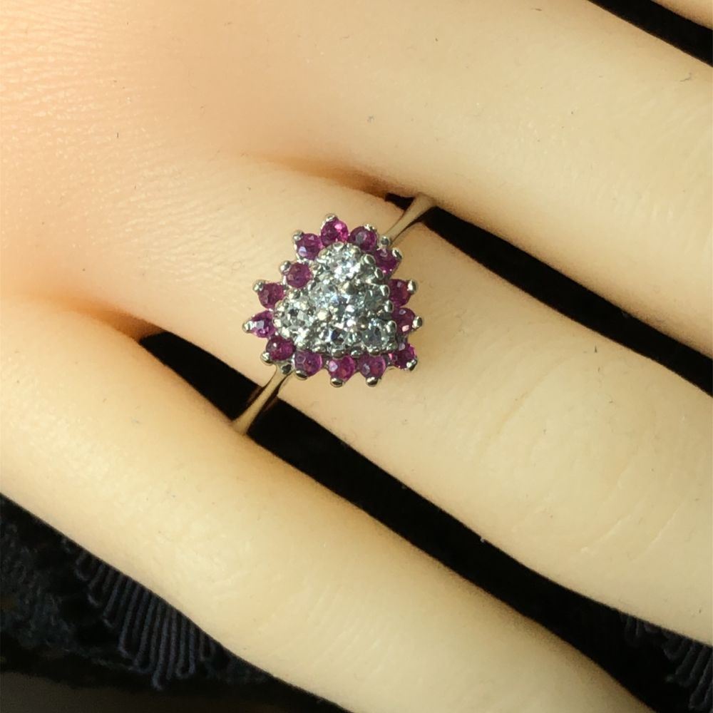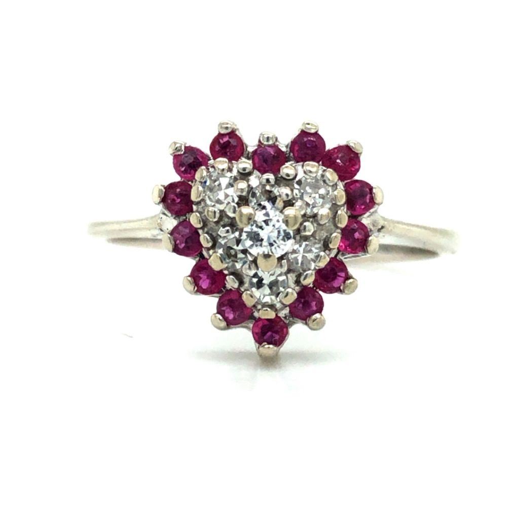 Genuine Ruby and Earth-Mined Diamond Ring.& nbsp; This is a vintage 14 karat white gold ring that hails from circa 1970's and designed in a heart-shape with approximately .40 carats of genuine round, faceted rubies in the out halo and approximately .20 carats of round, faceted diamonds in the center.& nbsp; The largest of the diamonds is a round, brilliant-cut diamond and raised slightly higher than the rest.& nbsp; The top of the ring is approximately 1/2& quot; diameter.& nbsp; This ring is US size 7.75 and has a ribbed gallery.& nbsp; This ring can be resized for an additional $100, please allow an additional 10 days for shipping if we resize it.& nbsp; This is a preowned, estate item in excellent condition.