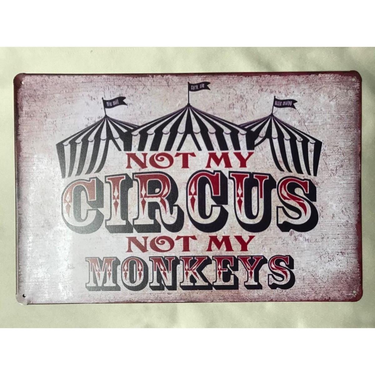 "Not My Circus, Not My Monkeys" metal pub bar sign. 7 3/4" X 11 3/4" with pre-drilled holes for mounting.Â