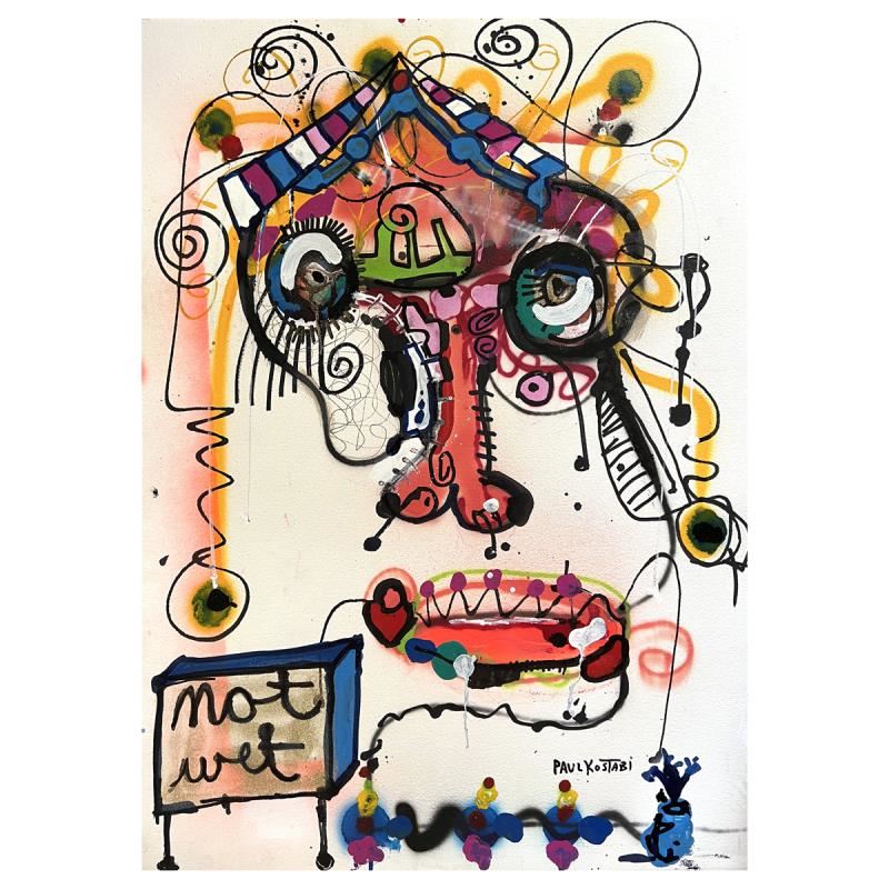 "Not Wet" is an original painting, mixed media on paper by Paul Kostabi. The piece comes hand signed by the artist and with a letter of authenticity. Measures approximately 41" x 29".