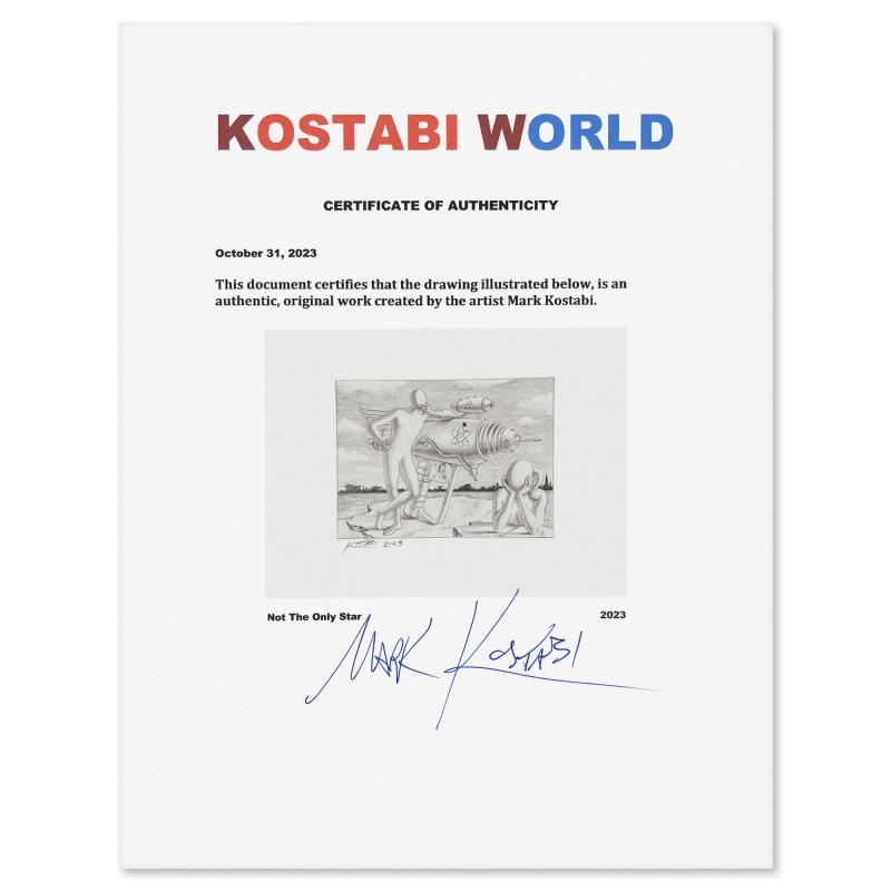 "Not the Only Star" is an original drawing on paper by Mark Kostabi, hand signed by the artist. This piece comes custom framed and includes a certificate of authenticity. Measures approximately 13.5" x 15" (frame), 7.5" x 9" (image). This item requires special handling and may have a longer than usual turnaround.