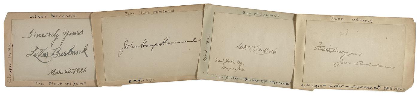 Fountain pen signatures of Luther Burbank, John Hays Raymond, Geo. W. Goethals, and Jane Addams on individual off-white cards, each affixed to slightly larger album pages. In very good condition, with scattered light toning and soiling, and collector’s notations to each album page.