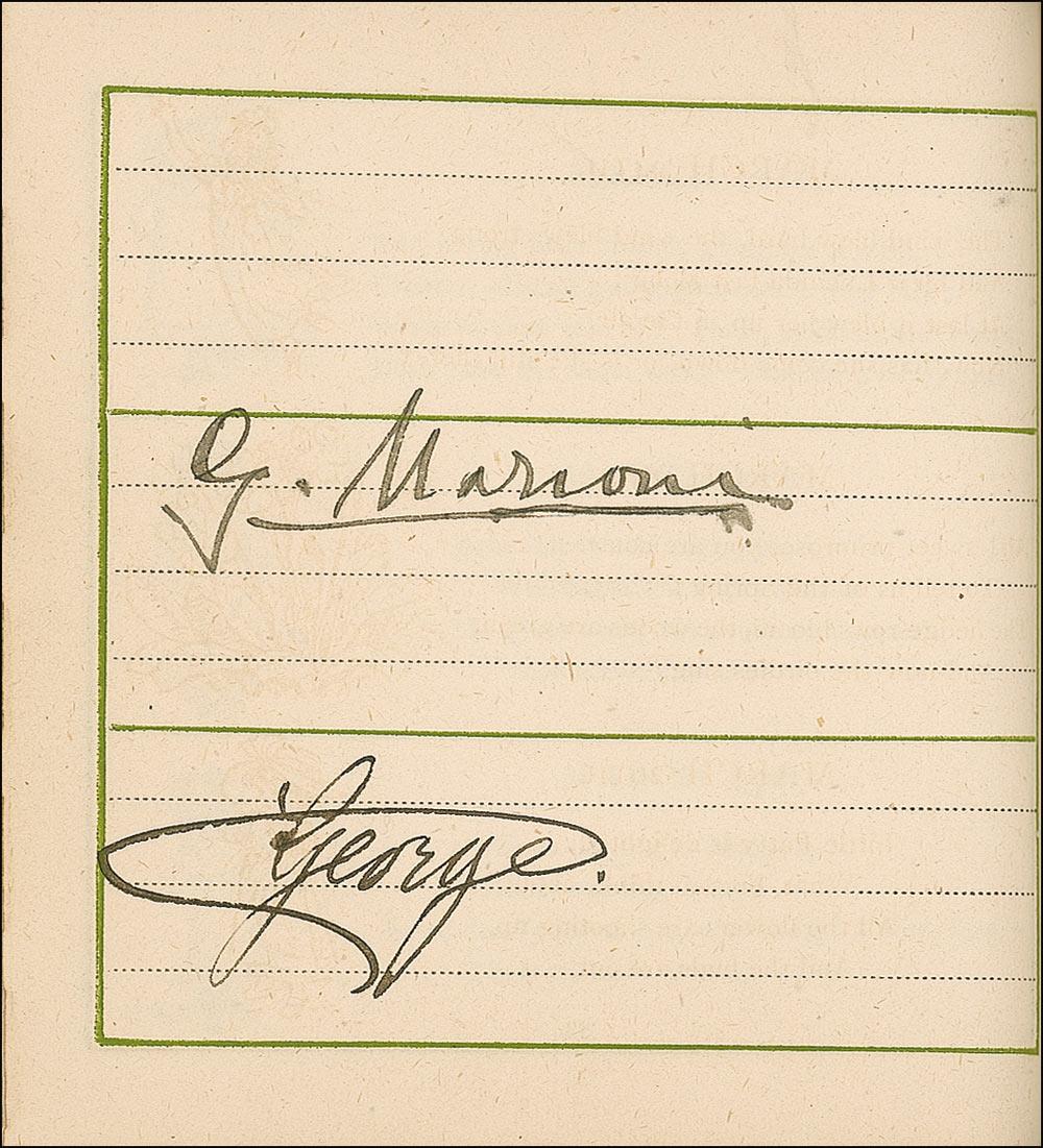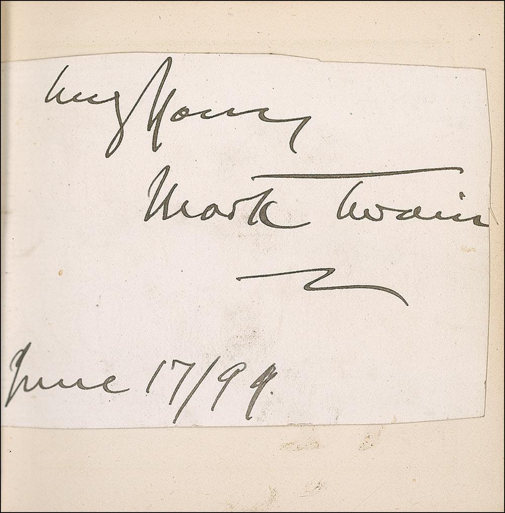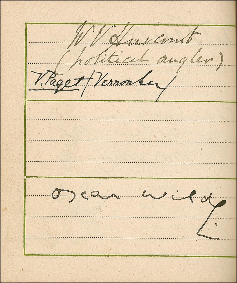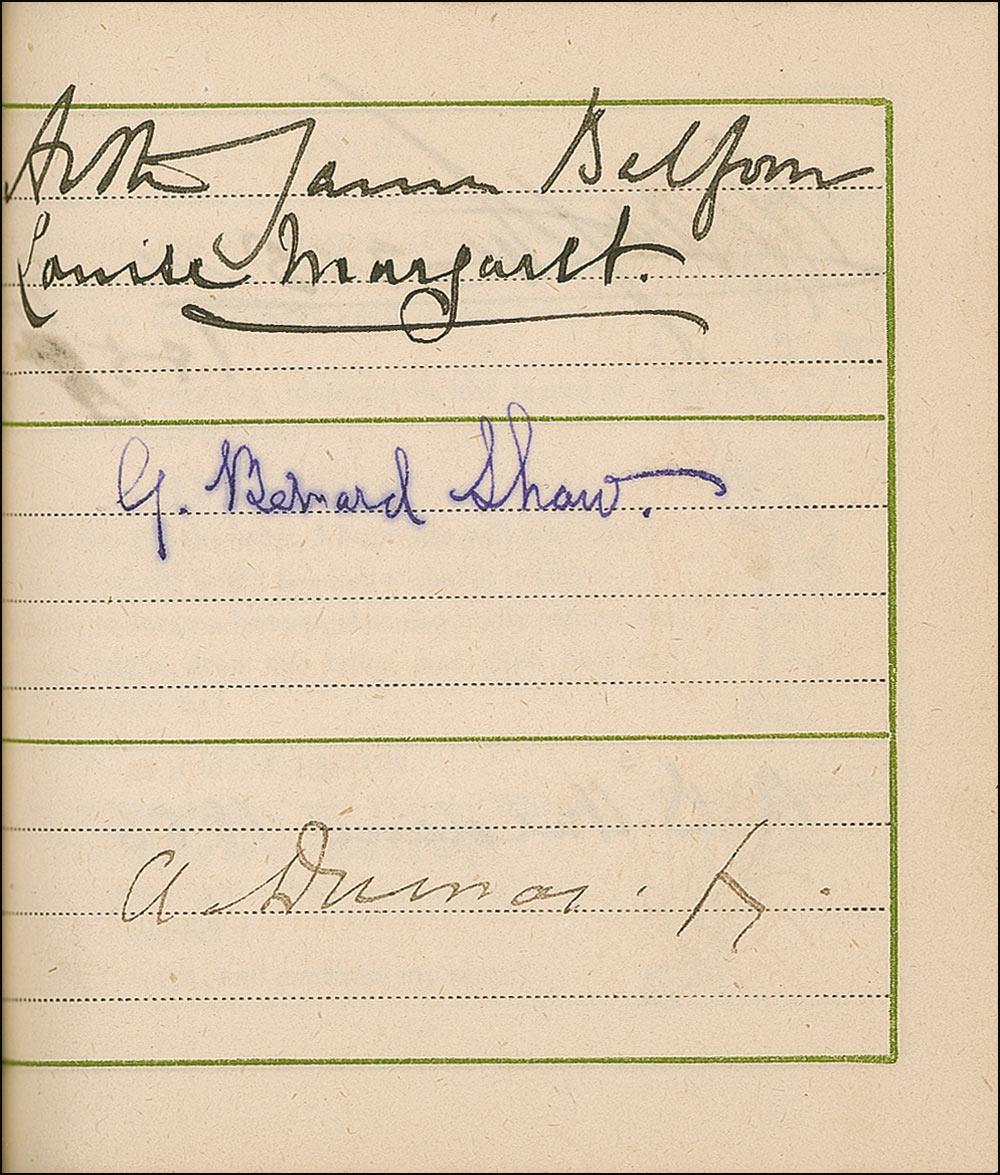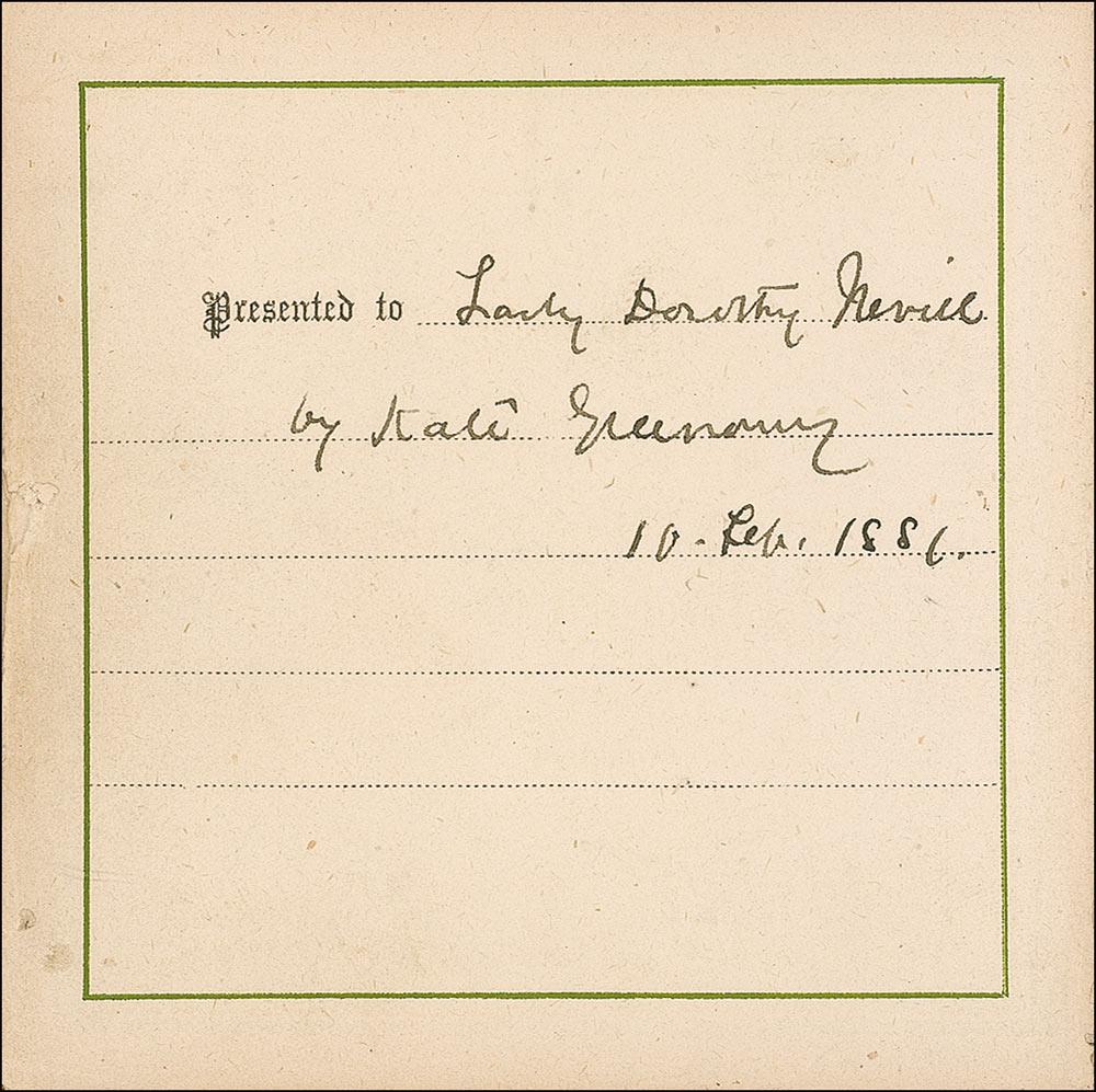 Beside Greenaway herself, the remarkable assemblage of signers include: Oscar Wilde, Charles Darwin, Louis Pasteur, Charles Dickens, George V, Queen Victoria, George Bernard Shaw, Arthur Sullivan, Algernon Swinburne, Alfred Lord Tennyson, Emile Zola, Arthur James Balfour, Beatrice, Sarah Bernhardt, James G. Blaine, Louis Botha, Paul Bourget, John Bright, Robert Browning, Randolph S. Churchill, Samuel Clemens (signing as Mark Twain), Edward VII (signing as Albert Edward), Francis, Duke of Teck, Alexander Dumas (fils), William Gillette, William Gladstone, H. Rider Haggard, Bret Harte, John Hay, Oliver Wendell Holmes, Edward Cardinal Howard, Victor Hugo, Henry Irving, James Russell Lowell, Guglielmo Marconi, Mary of Teck, Justin McCarthy, John Everett Millais, Helena Modjeska, John H. Cardinal Newman, Queen Alexandra, Queen Maud, John Ruskin, Ellen Terry, Herbert Cardinal Vaughan, and Otto von Bismark. A few opening pages detached (including Greenaway’s presentation page), some light toning and wrinkling from adhesive, brushing to a few signatures, and light wear to covers, otherwise fine condition.