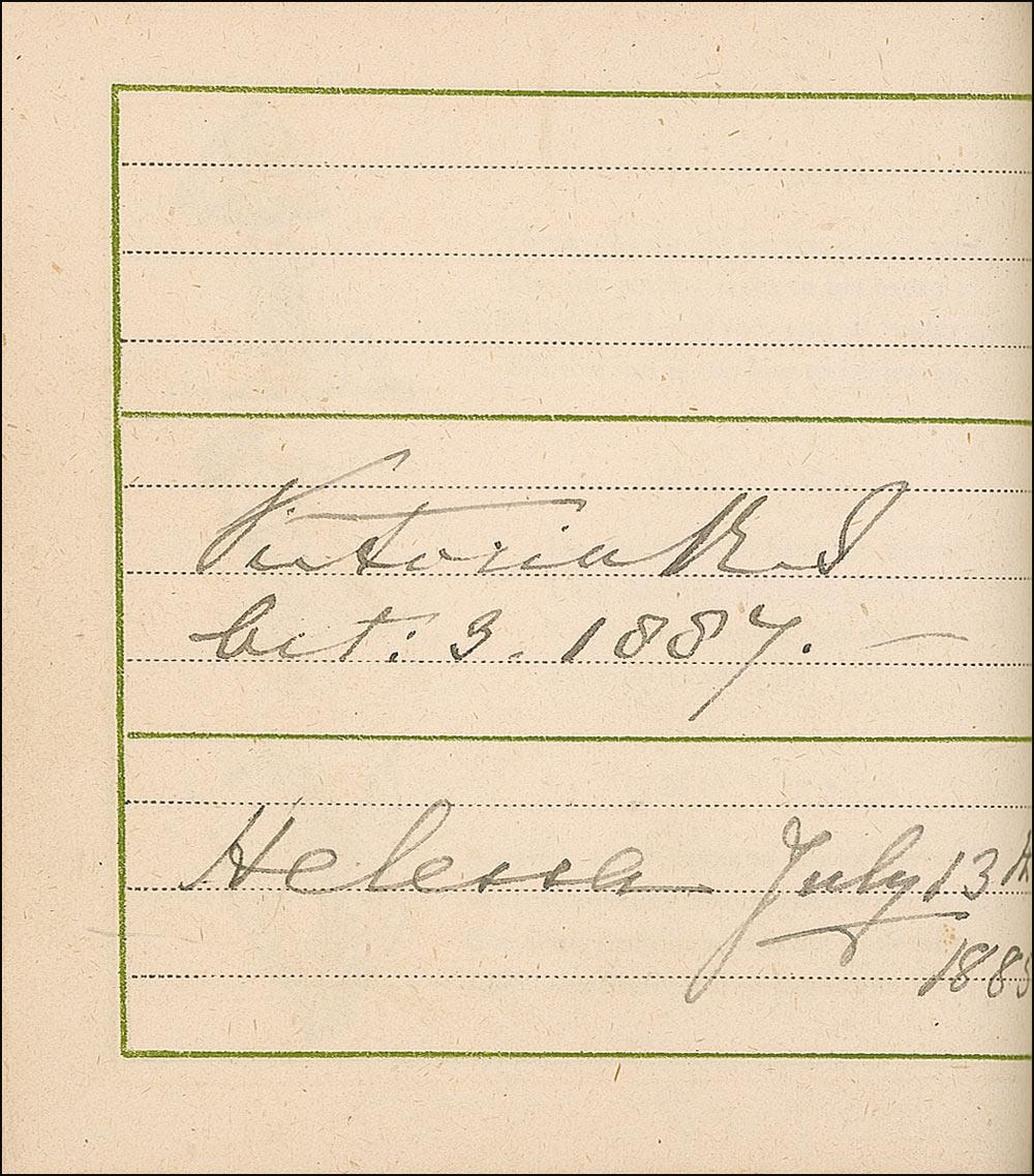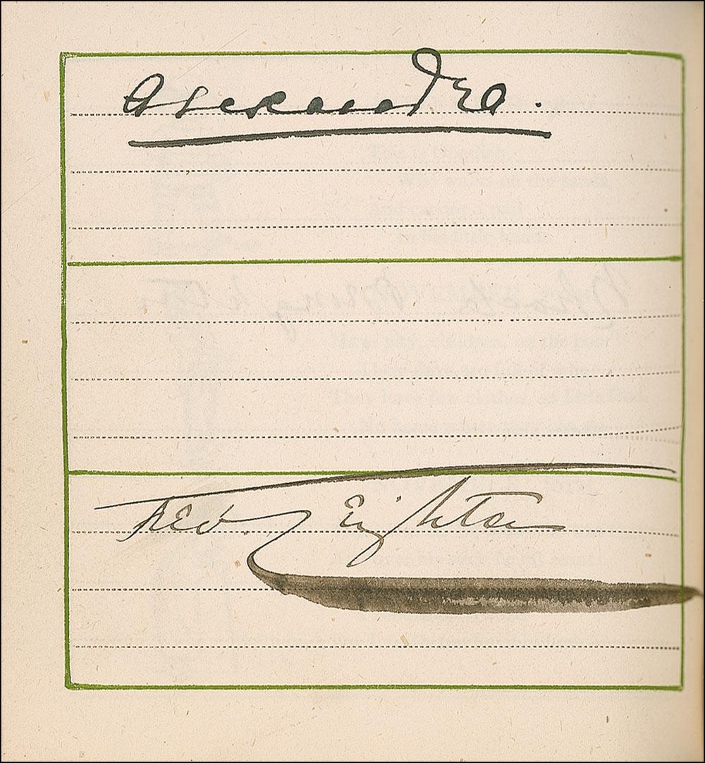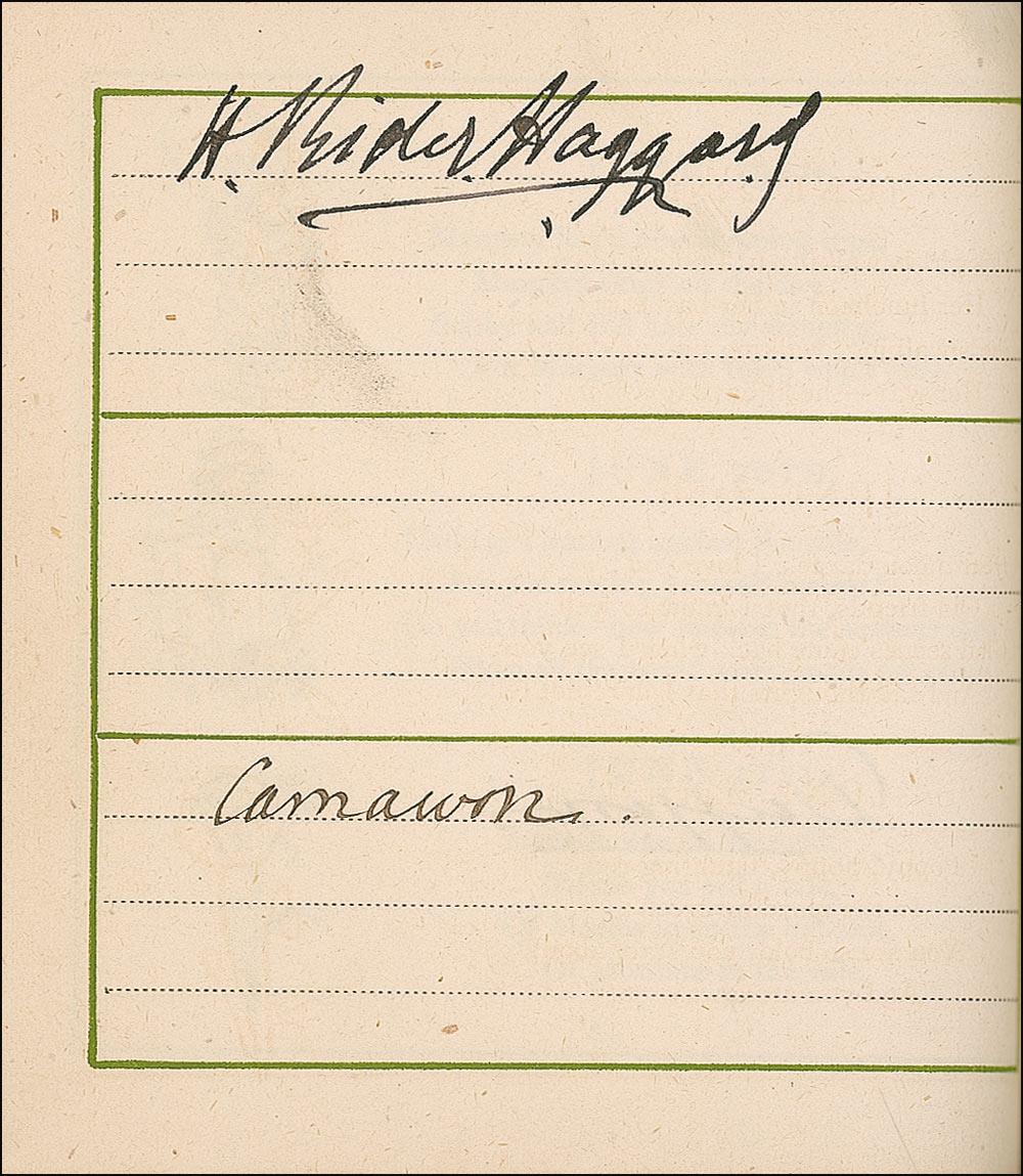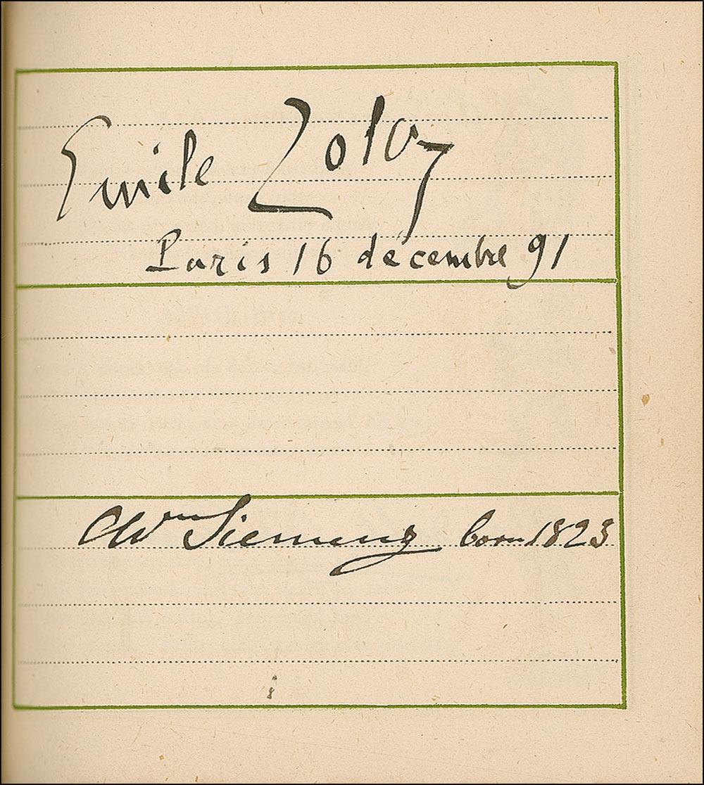 Beside Greenaway herself, the remarkable assemblage of signers include: Oscar Wilde, Charles Darwin, Louis Pasteur, Charles Dickens, George V, Queen Victoria, George Bernard Shaw, Arthur Sullivan, Algernon Swinburne, Alfred Lord Tennyson, Emile Zola, Arthur James Balfour, Beatrice, Sarah Bernhardt, James G. Blaine, Louis Botha, Paul Bourget, John Bright, Robert Browning, Randolph S. Churchill, Samuel Clemens (signing as Mark Twain), Edward VII (signing as Albert Edward), Francis, Duke of Teck, Alexander Dumas (fils), William Gillette, William Gladstone, H. Rider Haggard, Bret Harte, John Hay, Oliver Wendell Holmes, Edward Cardinal Howard, Victor Hugo, Henry Irving, James Russell Lowell, Guglielmo Marconi, Mary of Teck, Justin McCarthy, John Everett Millais, Helena Modjeska, John H. Cardinal Newman, Queen Alexandra, Queen Maud, John Ruskin, Ellen Terry, Herbert Cardinal Vaughan, and Otto von Bismark. A few opening pages detached (including Greenaway’s presentation page), some light toning and wrinkling from adhesive, brushing to a few signatures, and light wear to covers, otherwise fine condition.
