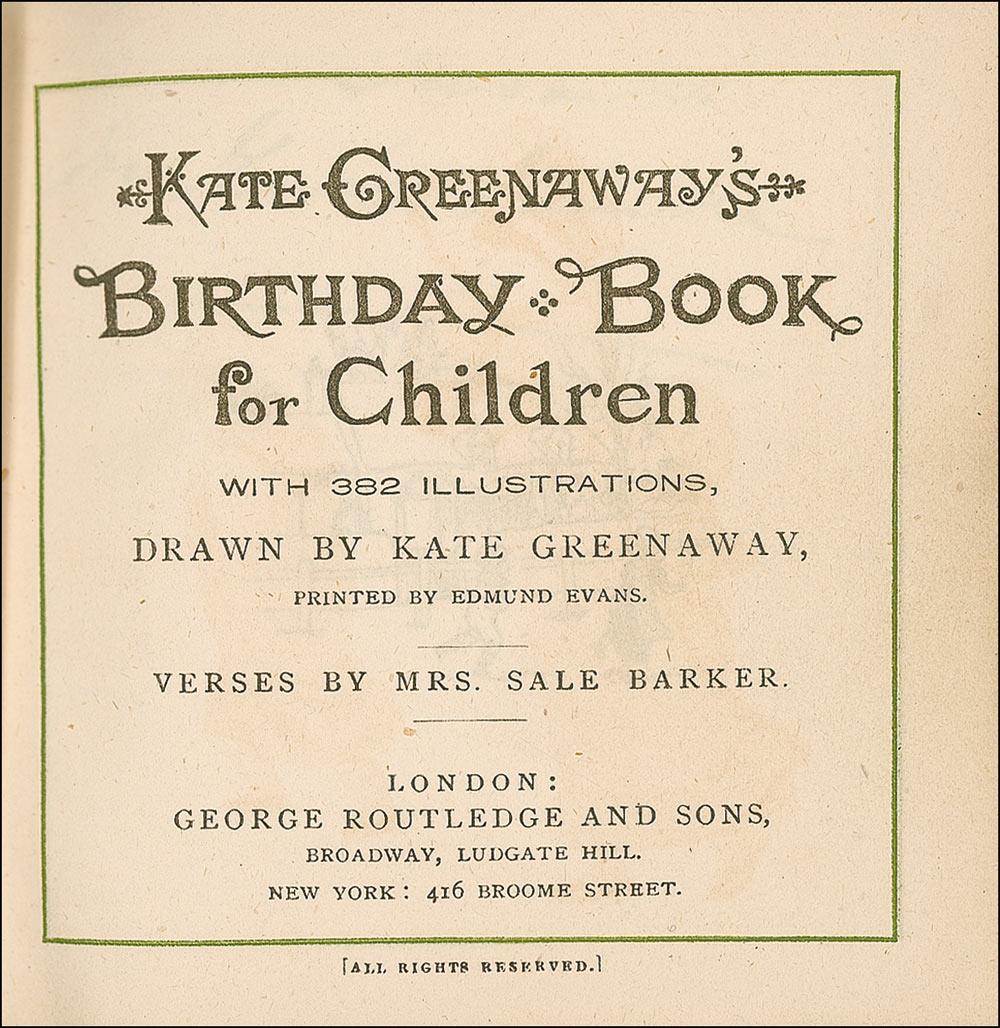 Leatherbound hardcover edition of Kate Greenaway’s Birthday Book for Children, 3.5 x 3.75, signed inside by 173 notables, authors, royalty and other people of distinction, with a small handful signing on clipped slips affixed to pages, while most are directly signed on the page of their respective birthdate, some multi signed pages, and some pages back to back. The opening detached presentation page, bears a gift presentation in Greenaway’s hand to “[Presented to]Lady Dorothy Nevill by Kate Greenaway, 10. Feb. 1886.”