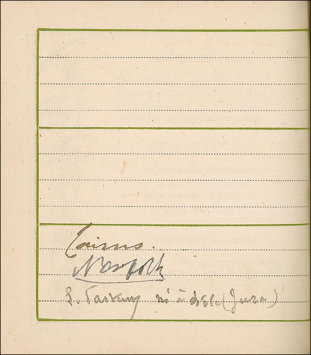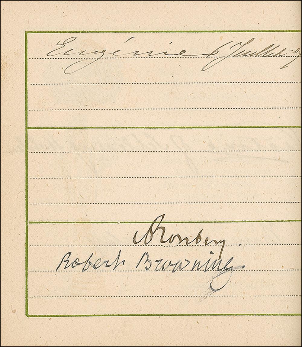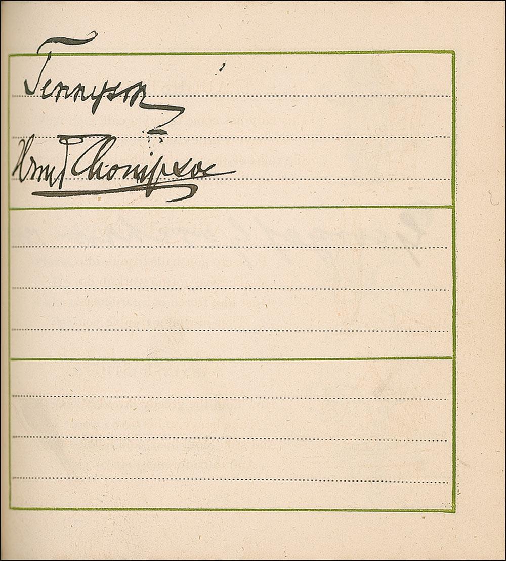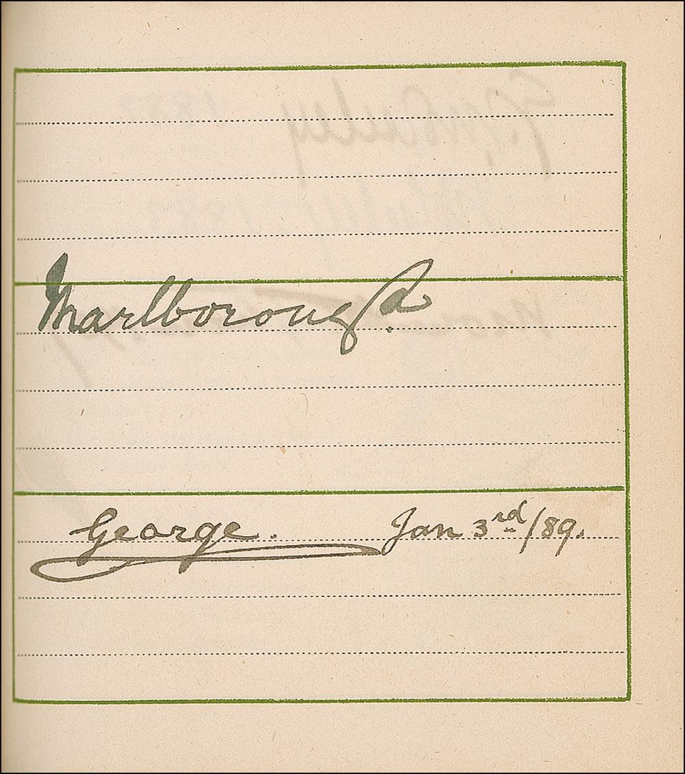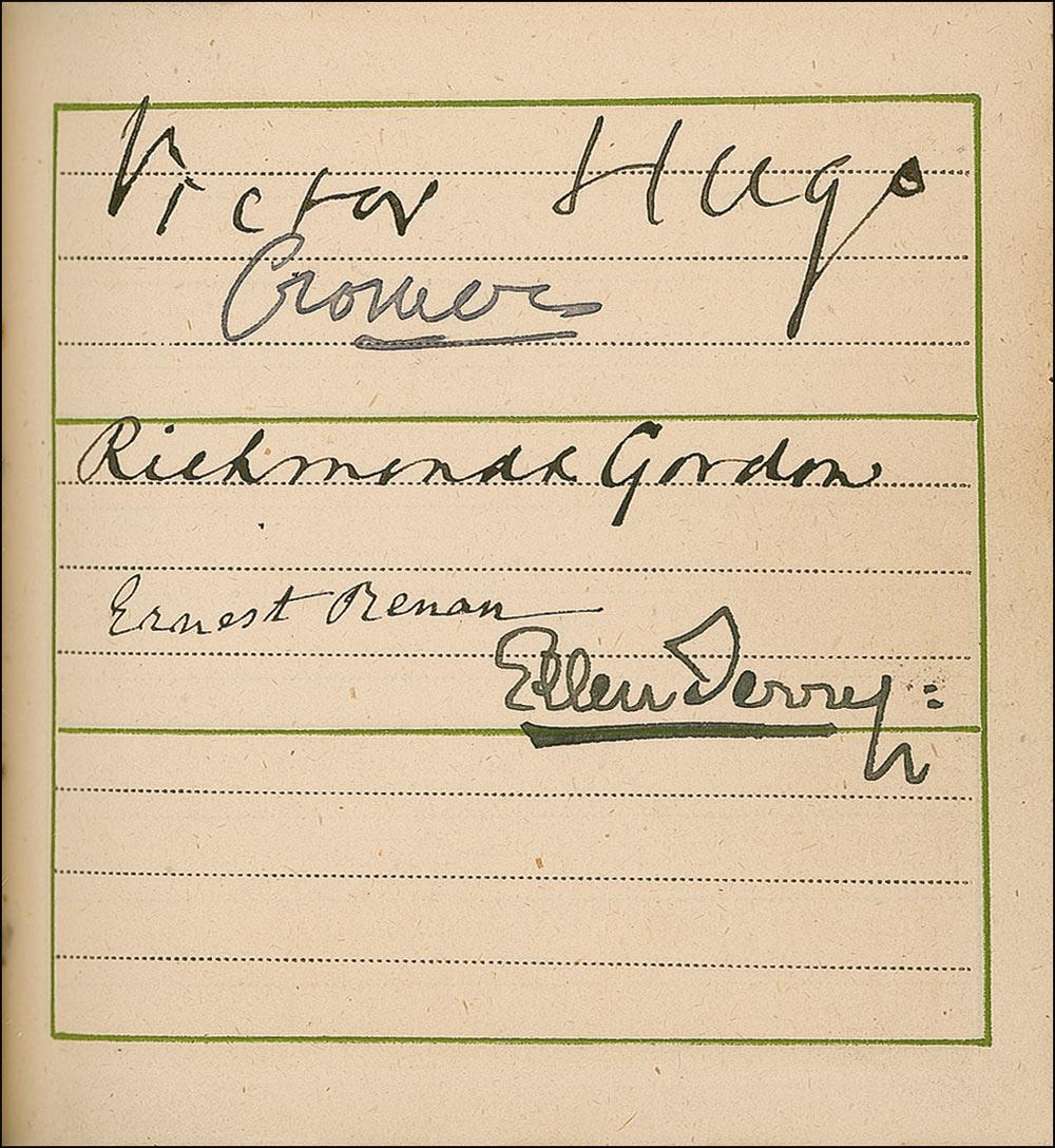 A famous illustrator and watercolorist, it is not surprising that Greenaway would be in presence of the many luminaries found in this album. It would also be no surprise that she would collect and present such a fine collection to Lady Dorothy Fanny Nevill. Lady Nevill (1826–1913) was a well-known English writer, hostess, collector and patron of Greenaway, who counted James McNeill Whistler and Charles Darwin among her friends. So many of the signatures on the actual pages of the book strongly implies that these were not the result of quick and random meetings, and it seems very likely that Greenaway carried this book with her for some time, spending great care in assembling the collection of signatures for Lady Nevill. This is a true gem…a truly one-of-a-kind collection!