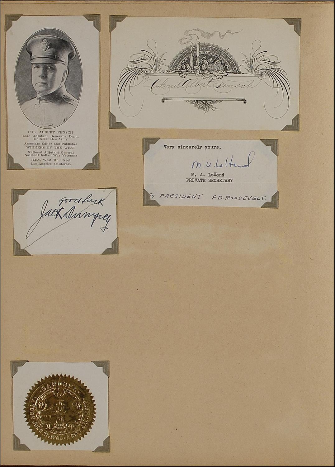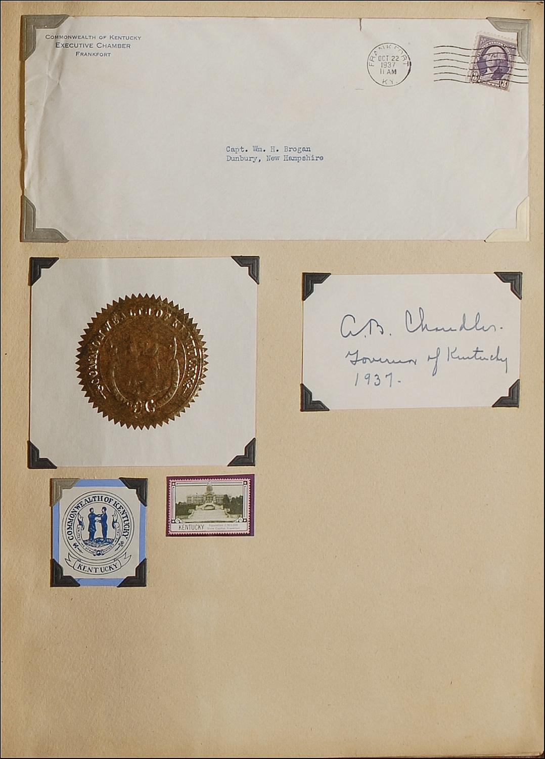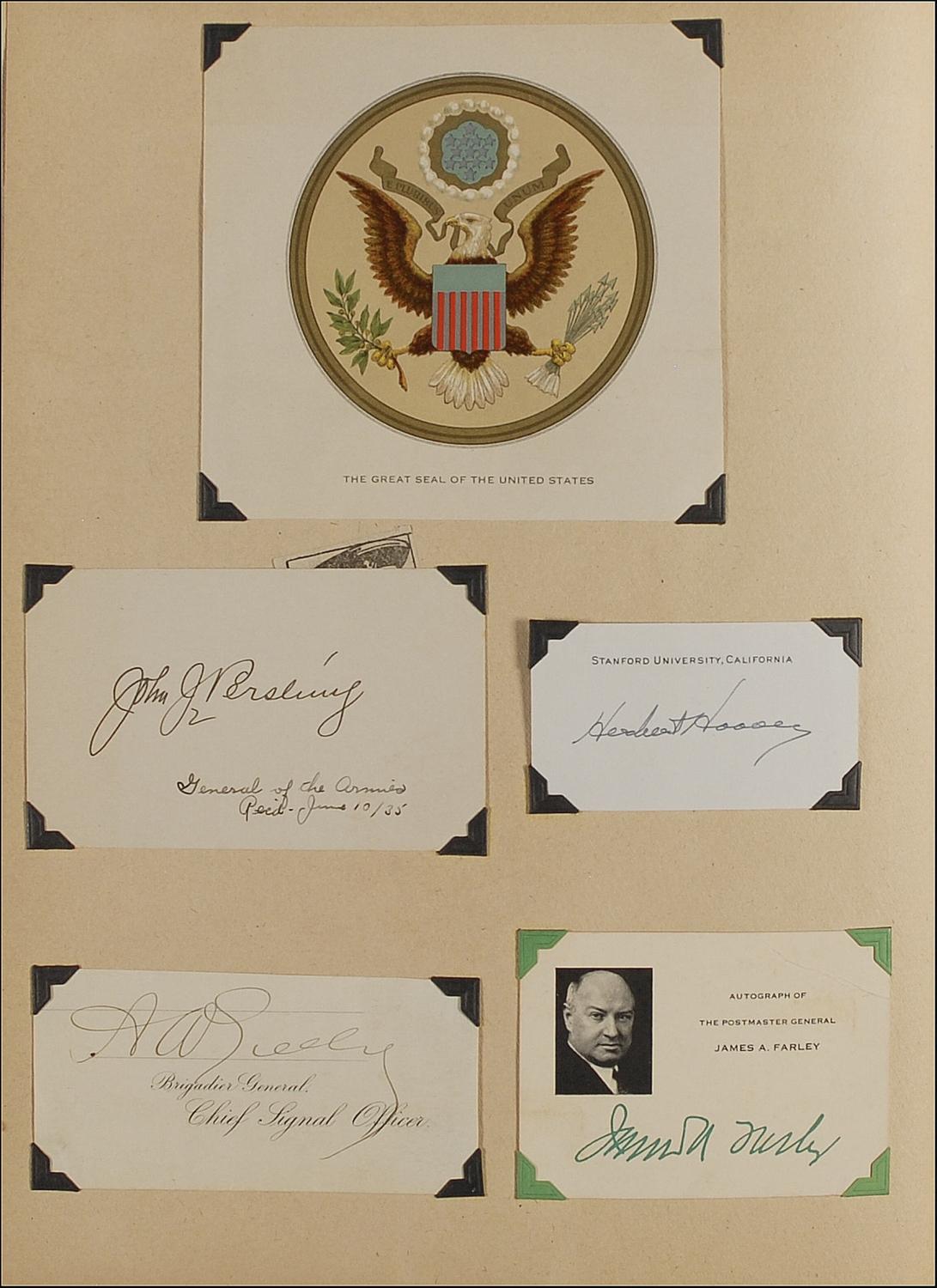 Collection of 73 gubernatorial and federal official signatures on various size cards, letters, and photos neatly contained in a scrapbook. Highlights include cards signed by Herbert Hoover, John J. Pershing, Adolphus Greely (signed “A. W. Greely”), and A. B. Chandler (adding “Governor of Kentucky 1937”). Other highlights include: cards, sheets, and slips signed by James Roosevelt, James A. Farley, Lewis Barrows, Charles Tobey, Francis Murphy, George Aiken, Charles Hurley, Robert Quinn,Wilbur Cross, Herbert Lehman, Thomas Dewey, Harry Moore, George Earle, Richard McMullen, Harry Nice, George Peery, Homer Holt, Eurith Rivers, Olin Johnston, Fred Cone, Bibb Graves, James Allred, Martin Davey, James Bricker, Ernest Marland, Clifford Townsend, Henry Horner, Philip La Follette, Nelson Kraschel, Elmer Benson, Lloyd Stark, Walter Huxman, Alf Landon, R. L. Cochran, William Langer, Leslie Jensen, Leslie Miller, Clyde Tingley, R.C. Stanford, Richard Kirman, Henry Blood, Roy Ayers, Barzilla Clark, Clarence Martin, Charles Martin, Frank Merriam, Blanton Winship, J. L. Schley, John W. Troy, Joseph Poindexter, and Lawrence Cramer; Photo signed by Wilbur Cross; Letters signed by Clyde Hoey, George Browning, Hugh White, R. W. Leche, Carl Bailey, Frank Murphy, Lloyd Stark, Walter Huxman, William Langer, Teller Ammons, Leverett Saltonstalland, Paul McNutt, and Frank Merriam. Accompanied by a card signed in ink by Jack Dempsey and many unsigned state brochures, maps, photos, and original mailing envelopes. In overall very good to fine condition.