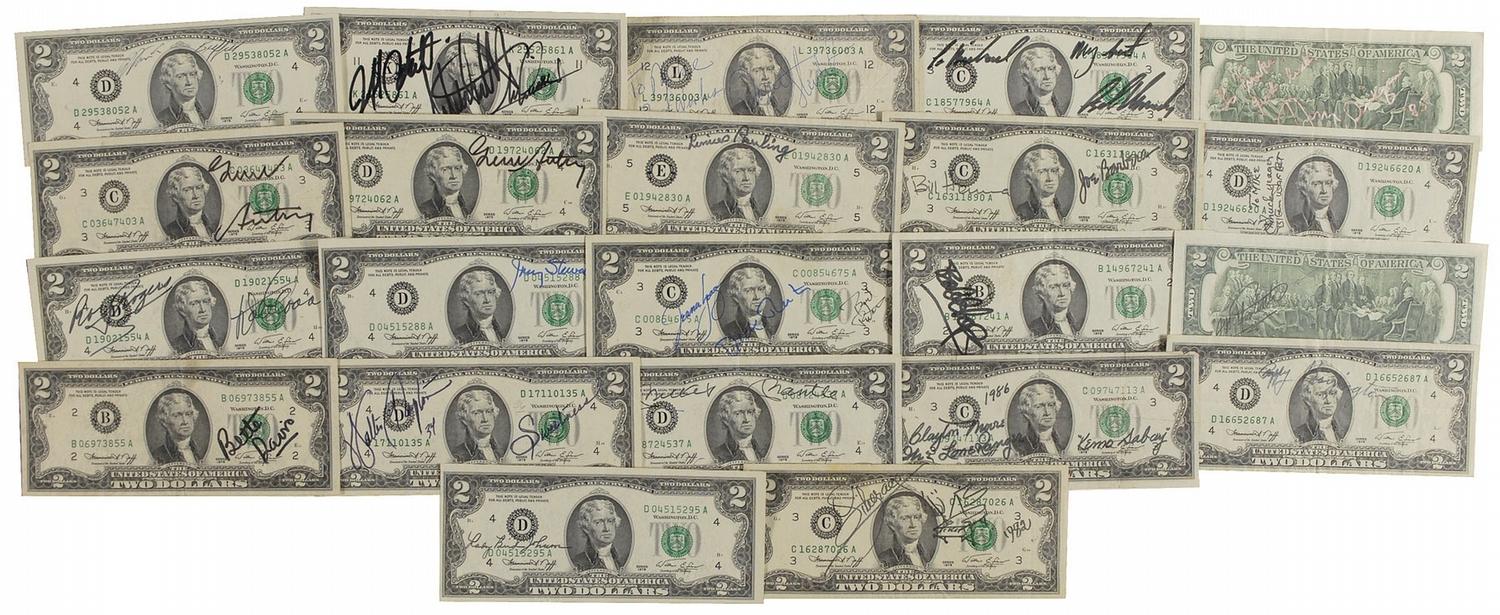 Twenty-two two dollar bills, each signed in ink or felt tip by a different notable. Signers are: Warren Buffett, Chuck Yeager (ins),Bill Hanna and Joe Barbera, Linus Pauling, Gene Autry (2), Roy Rogers and Dale Evans, James Stewart, Deana Yeager, Rutan, and Burton, Bob Hope, James Doolittle, Pappy Boyington, Clayton Moore, Mickey Mantle, Walter Payton, Bette Davis, Liberace (adding a small piano sketch), Lady Bird Johnson, Dizzy Gillespie (ins), Ted Kennedy (ins), Payne Stewart (ins), and one other multi-signed bill with Mario Andretti. In fine overall condition.
