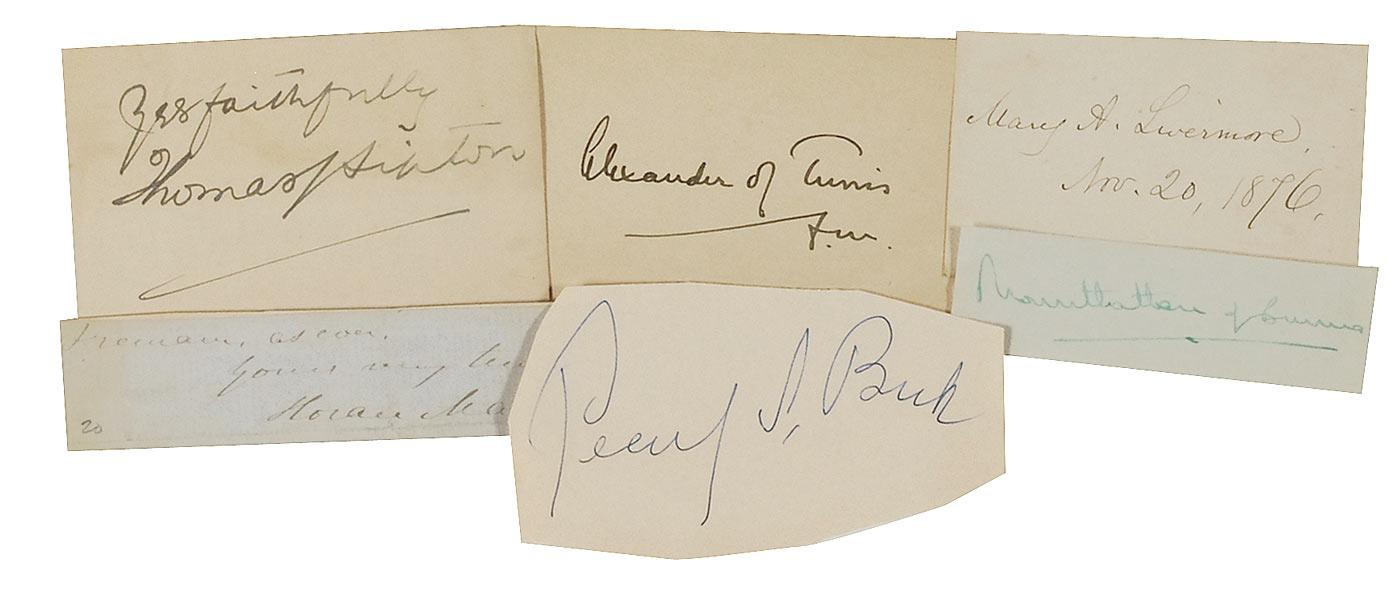 Six ink and ballpoint signatures on various size cards and clipped slips. Signers are: Pearl S. Buck, Mountbatten of Burma, Horace Mann, Alexander of Tunis, Thomas Lipton, and Mary A. Livermore. In very good condition, with scattered toning and soiling.
