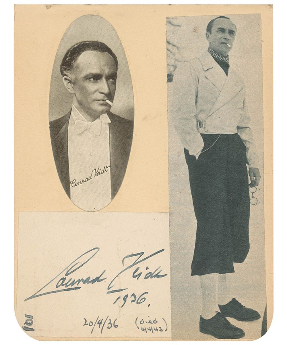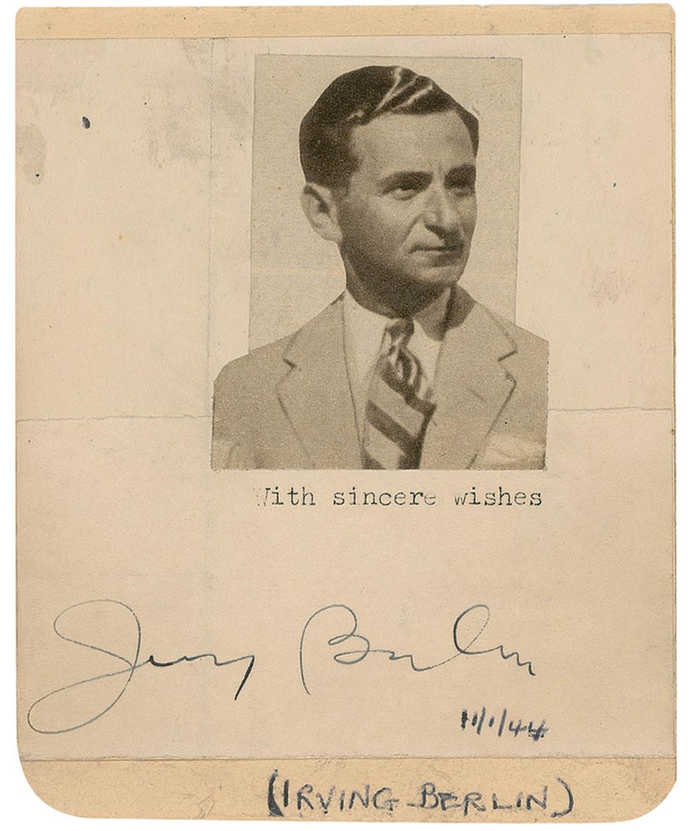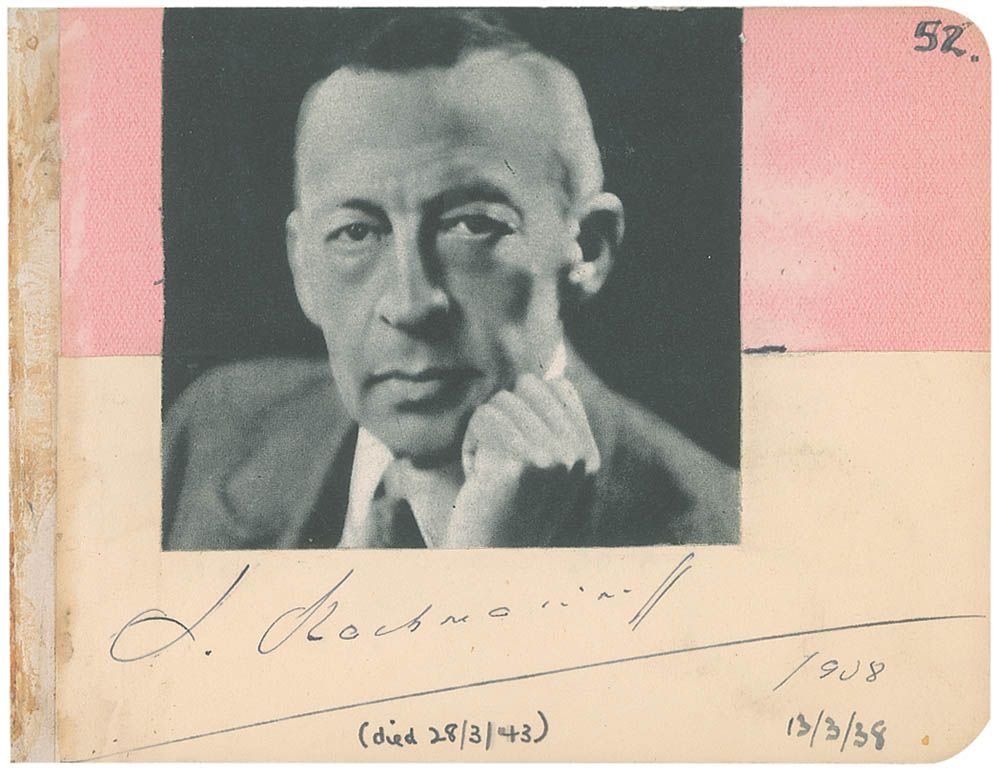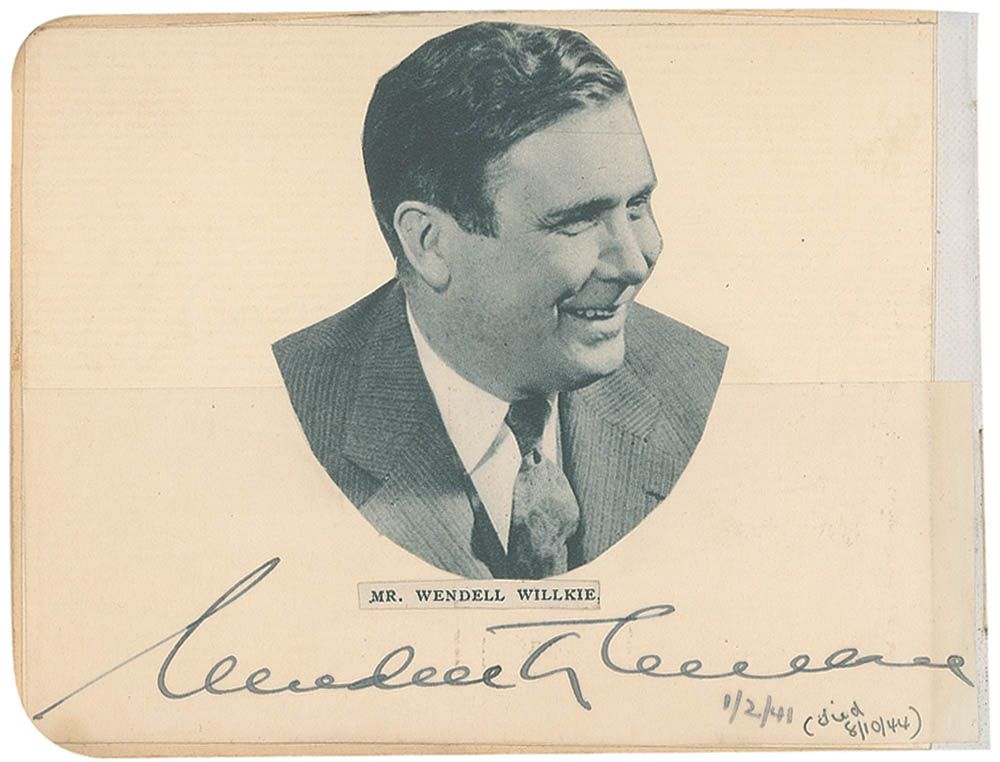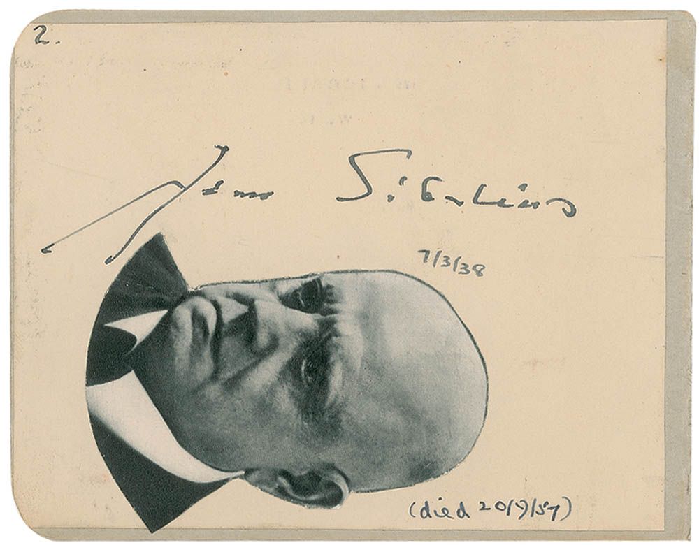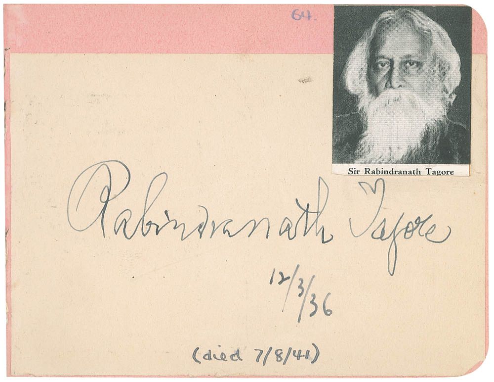 Vintage British autograph album, 5 x 4, 84 pages with over 100 signatures, including politicians, musicians, religious leaders, and athletes. Most pages are signed on both sides, and many are cut signatures affixed to the album page. Signers include: Jean Sibelius, Sergei Rachmaninoff, Rabindranath Tagore, Wendell Willkie, Conrad Veidt, Irving Berlin, Suzanne Lenglen, Mae West, Bill Tilden, Sybil Thorndike, George Arliss, and Robert Donat. Most pages have a small photo of the celebrity affixed along with collector’s notation indicating the date the signature was acquired as well as the date of the person’s death. In very good condition, with many pages separated from the binding but in themselves fine condition.