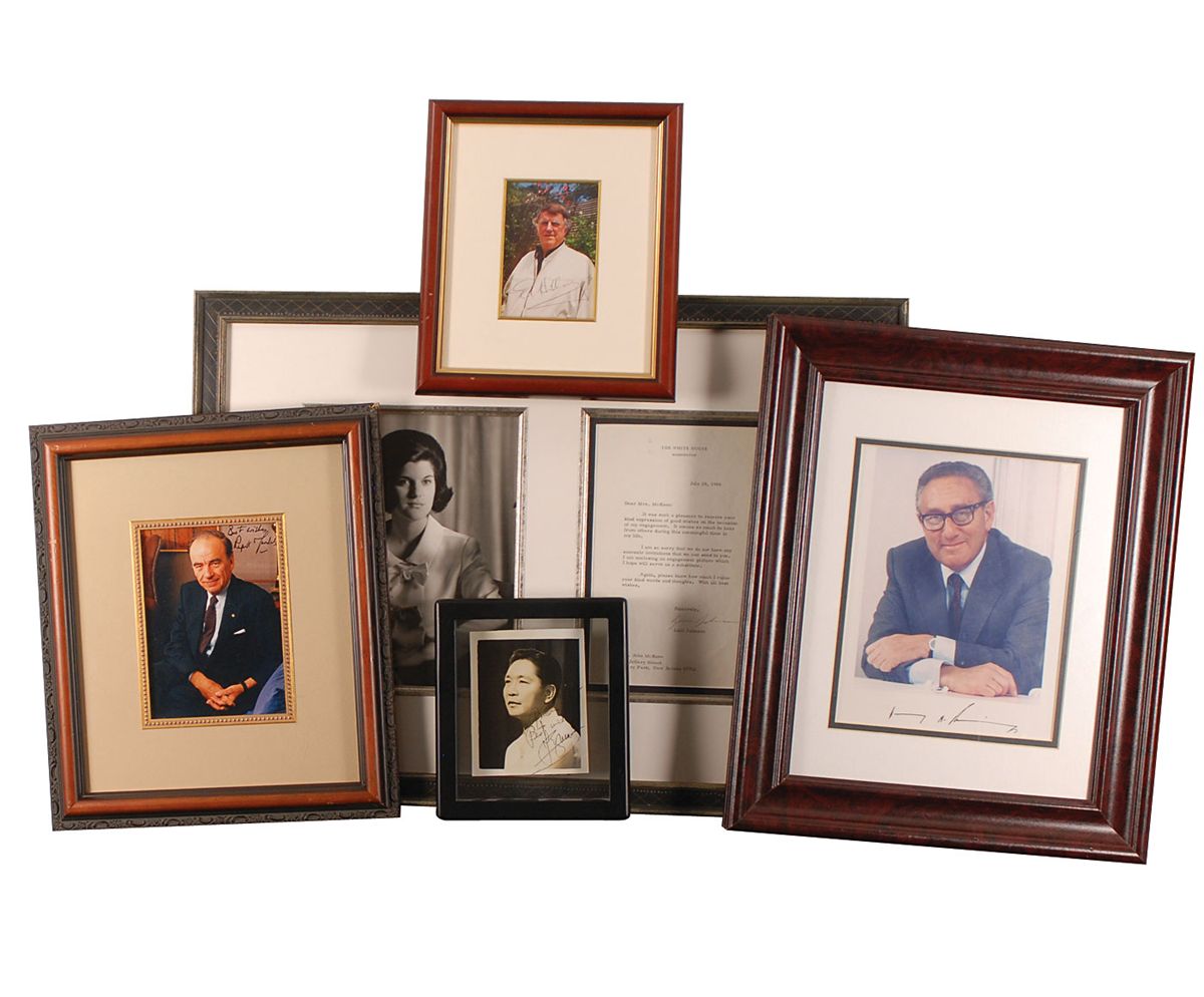 Five items: a vintage glossy 4 x 5 photo of Ferdinand Marcos, signed and inscribed in fountain pen; a color satin-finish 3.25 x 5 photo of Edmund Hillary, signed in black ballpoint; a color 7.5 x 9.5 photo of Henry Kissinger, signed in the lower border in black ink; a 1966 TLS, signed “Lucie Johnson,” on a 6 x 9.25 sheet of White House stationery; and a color 5 x 7 photo of Rupert Murdoch, signed in black felt tip. Each item is individually framed to overall sizes ranging from 6.5 x 7.5 up to 25 x 18. In overall fine condition.