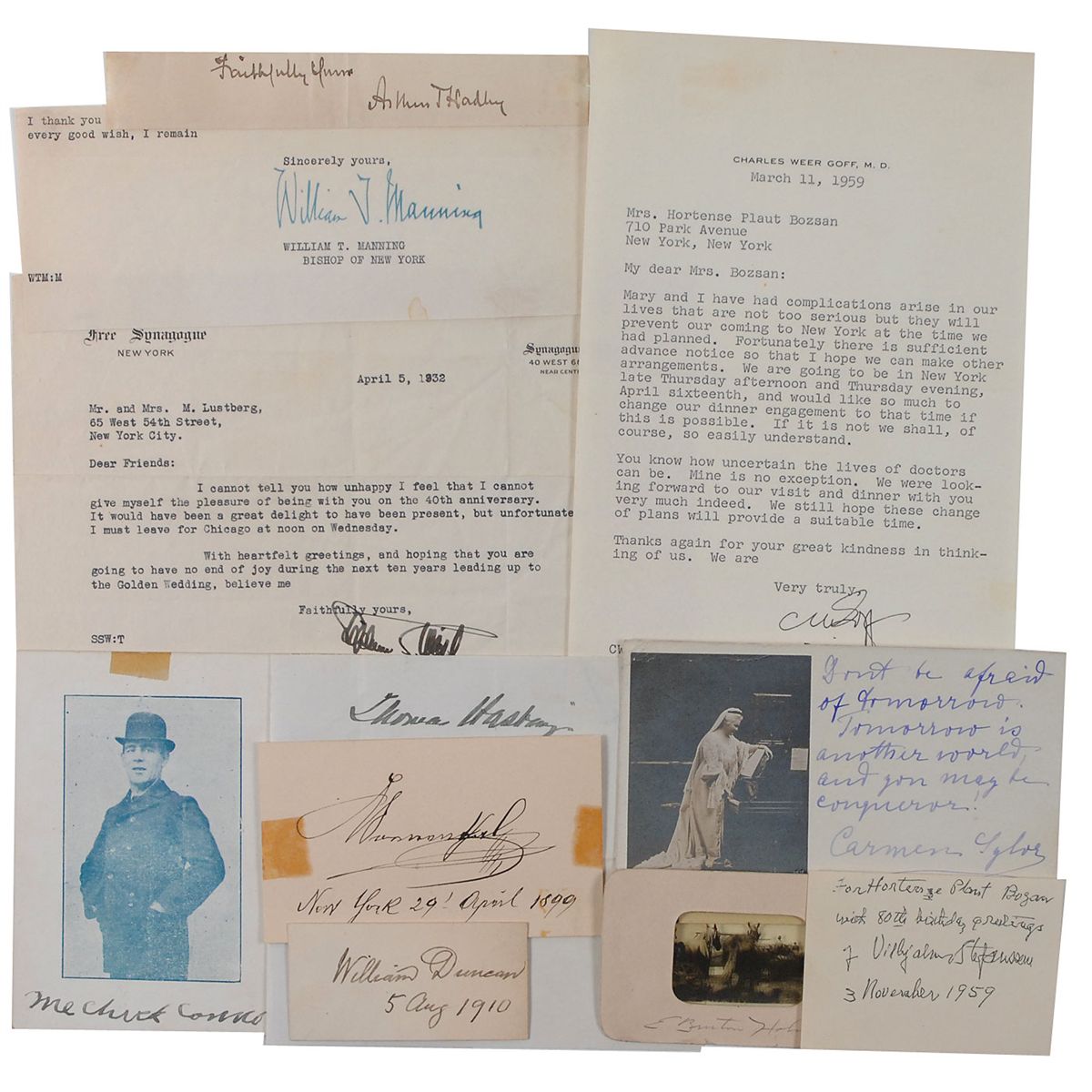 Collection of 11 items consisting of signatures, letters, and a couple of signed photos, each signed by a different notable. TLSs are from Stephen Samuel Wise and Charles Weer Goff; signatures are from Adolf von Sonnenthal, William Duncan, Thomas Hastings, William T. Manning, Arthur T. Hadley, Elisabeth of Wied, and Vilhjalmur Stefansson; and photos are signed by Chick Connors and E. Burton Holmes (signed on a slide frame). In overall fine condition.