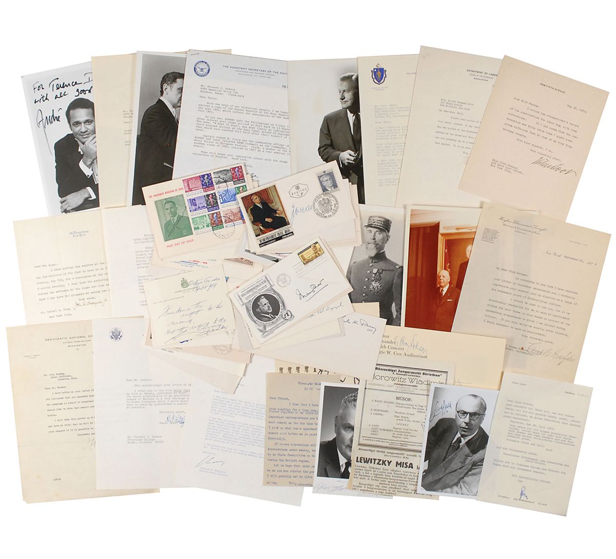 Scrapbook consisting over 160 letters, covers, signatures, and a couple of photos, many signed by key figures in the fields of finance, politics, music, and other areas, with other items of note bearing printed or secretarial signatures. Signers include: David Ben-Gurion, Willie Brandt, George and Barbara Bush, Madame Chiang Kai-Shek, Van Cliburn, Abba Eben, Dwight D. Eisenhower, Arthur Fiedler, Park Chung Hee, Vladimir Horowitz, Charles Evans Hughes, Franz Jonas, Yousef Karsh, King Hussein of Jordan, Evelyn Lincoln, Henry Cabot Lodge, Charles W. Mayo, Robert McNamara, Jawaharlal Nehru, Mohammad Reza Pahlavi, Arnold Palmer, Floyd Patterson, Nelson Rockefeller, Elihu Root, Dean Rusk (2), Fulton J. Sheen, Abe Silverstein, Albert Speer, Adlai Stevenson, Josip Tito, and Stefan Cardinal Wyszynski. In very good to fine overall condition.