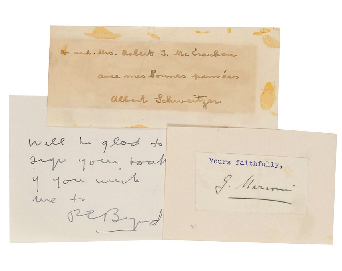 Collection of three items, each signed by a notable pioneering figure, including: Albert Schweitzer (ANS), Guglielmo Marconi (signature), and Richard E. Byrd (ANS). In overall very good to fine condition, with significant toning to the Schweitzer and a vertical fold to the Marconi.