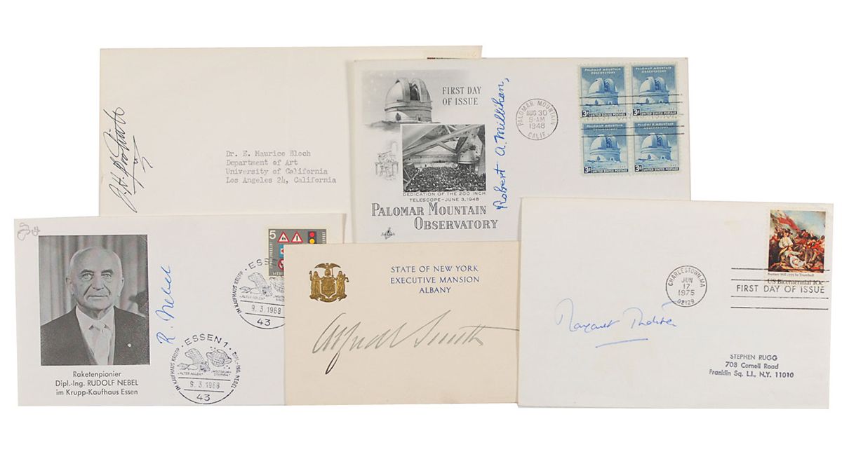 Collection of approximately 150 items comprised of covers, cards, and free franks, each signed by a notable figure from an array of fields such as military, and politics, including: James Doolittle, Charles Curtis, Lillian Gish, Alexander Seversky, Fiorello La Guardia, Margaret Thatcher, James Farley, Robert Millikan, Albert Lebrun, Rudolf Nebel, Al Smith, and Irving Wallace. In overall fine condition.