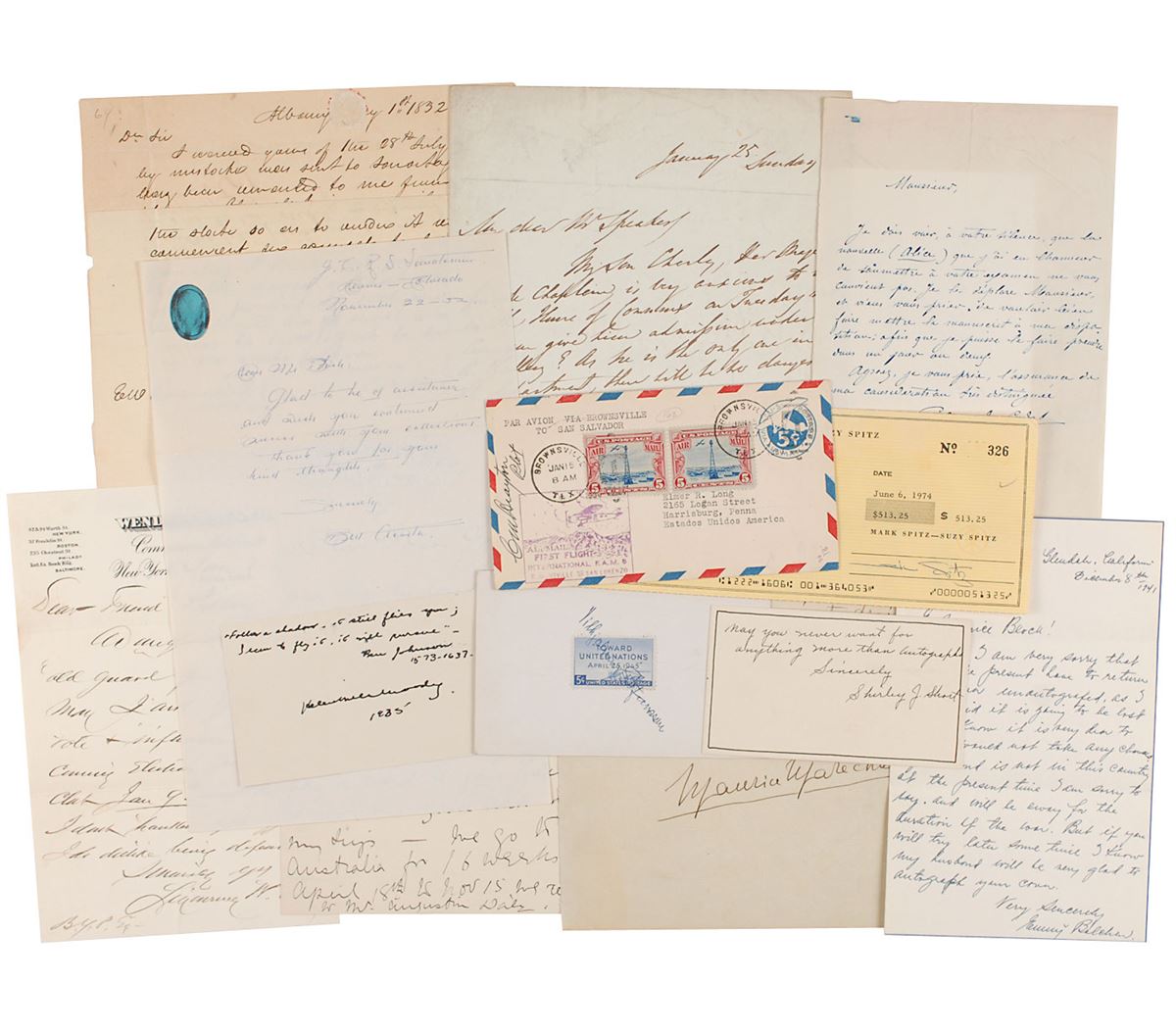 Collection of approximately two hundred items contained within four binders, generally 1800s and beyond with a few Revolutionary War–era documents, consisting primarily of letters and signatures by obscure figures in politics and the arts. A selection of some more notable names include U. S. Grant (faded signature), Gerald Ford (SP), Vilhjalmur Stefansson (postage stamp), Bert Acosta (TLS), Helen Wills (signature), and Mark Spitz (check). In overall very good to fine condition.