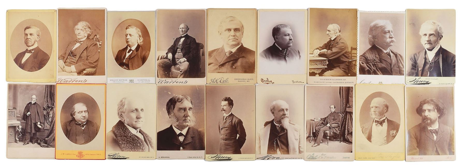 Collection of 18 unsigned cabinet photos of notable figures from a variety of fields, including writers, politicians, religious figures, artists, and others. Subjects include: Oliver Wendell Holmes, Charles Sumner, Henry Ward Beecher, Wendell Phillips, Phillips Brooks, William Dean Howells, William Ewart Gladstone, Melville Fuller, Arthur Penrhyn Stanley, Frederic Dan Huntington, Ernest Renan, Francis Seymour Haden, George William Curtis, William Black, Antonio Guzman Blanco, Eleazer M.P. Wells, Thomas Hughes, and Alphonse Daudet. In overall fine condition.