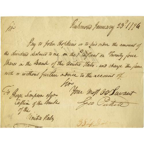 <B>Autograph Note Signed by George Pickett</B></I> to John Hopkins (who endorses on verso), dated January 23, 1796, the note assigns dividends of shares in the First Bank of the United States. Hopkins is likely the father of the famous Johns Hopkins who at the time of his death had amassed $2.25 million worth of Baltimore Ohio stock and was a stock holder in every major bank in Richmond. An interesting association item. Crisp and clean, 7" x 5.5", trimmed from it's original transmittal. Very fine.