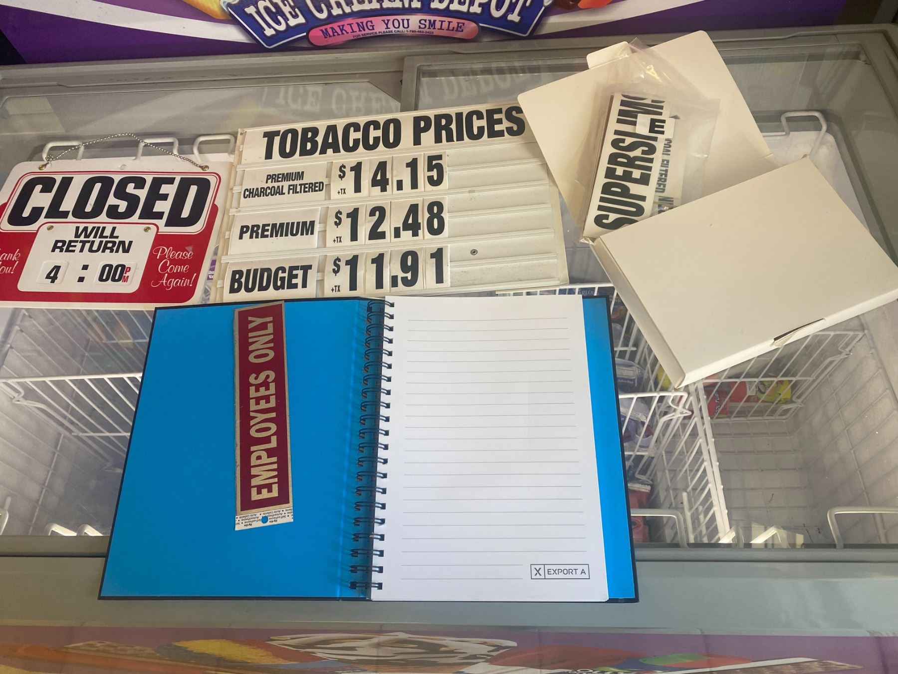 Notebook and signs