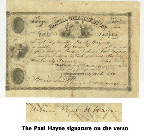 Paul Hayne. DS. 2pp. 9 3/4" x 7". Charleston. 27 Mch 1852. A Bank of Charleston stock certificate signed by poet Paul Hayne on the verso. The 15 shares were issued to Hayne's wife, Emily. There is an engraved vignette of state seal. There is light overall browning and folds, but Hayne's signature is dark. A fine association between a well-known Charleston poet and a stock certificate.